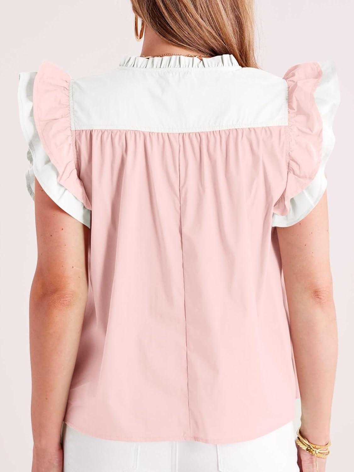 Tankaneo Womens Ruffle Color Block Tank Tops Summer Casual Dressy V Neck Pleated Blouse Loose Fit Sleeveless Shirts(Light Pink)