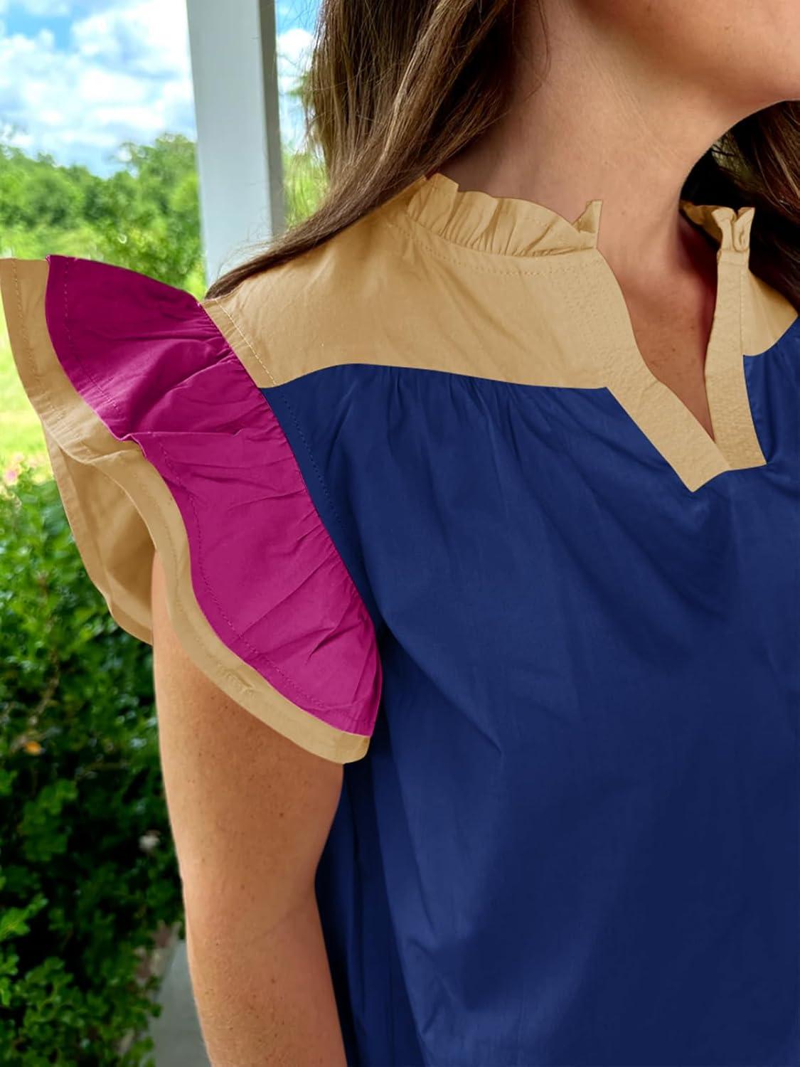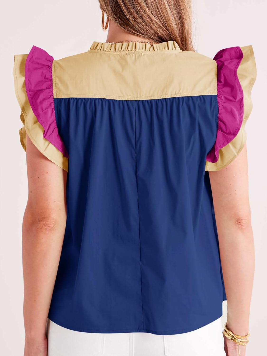 Tankaneo Womens Ruffle Color Block Tank Tops Summer Casual Dressy V Neck Pleated Blouse Loose Fit Sleeveless Shirts(Navy)