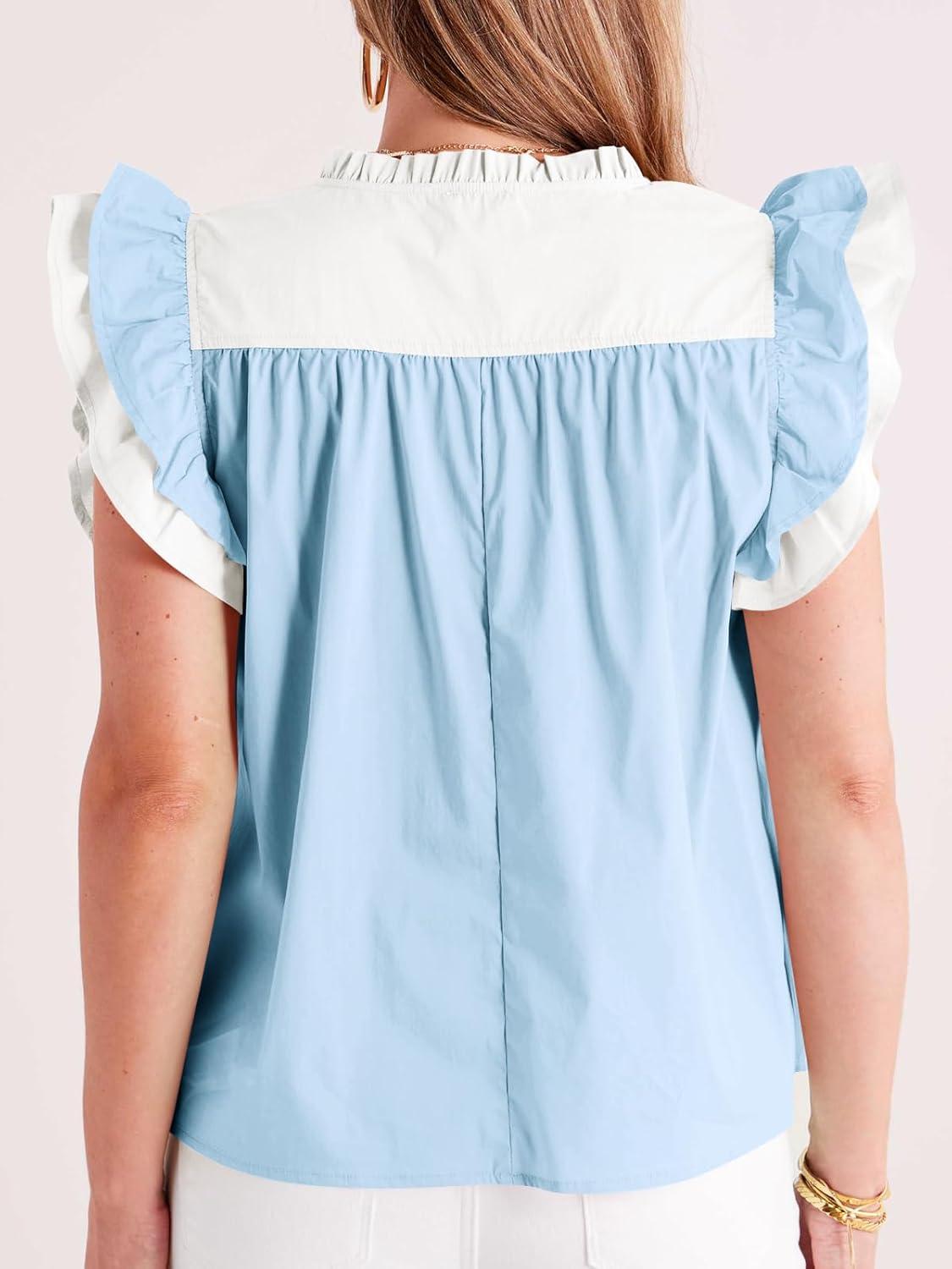Tankaneo Womens Ruffle Color Block Tank Tops Summer Casual Dressy V Neck Pleated Blouse Loose Fit Sleeveless Shirts(Pale Blue)