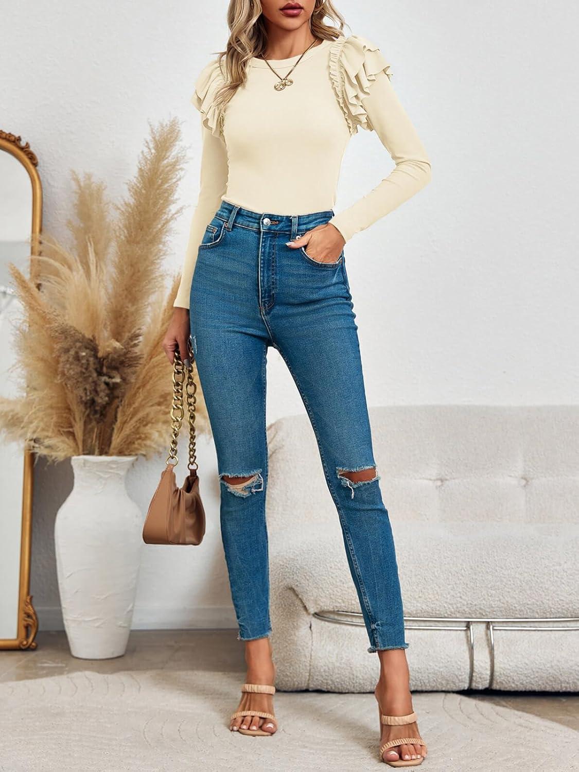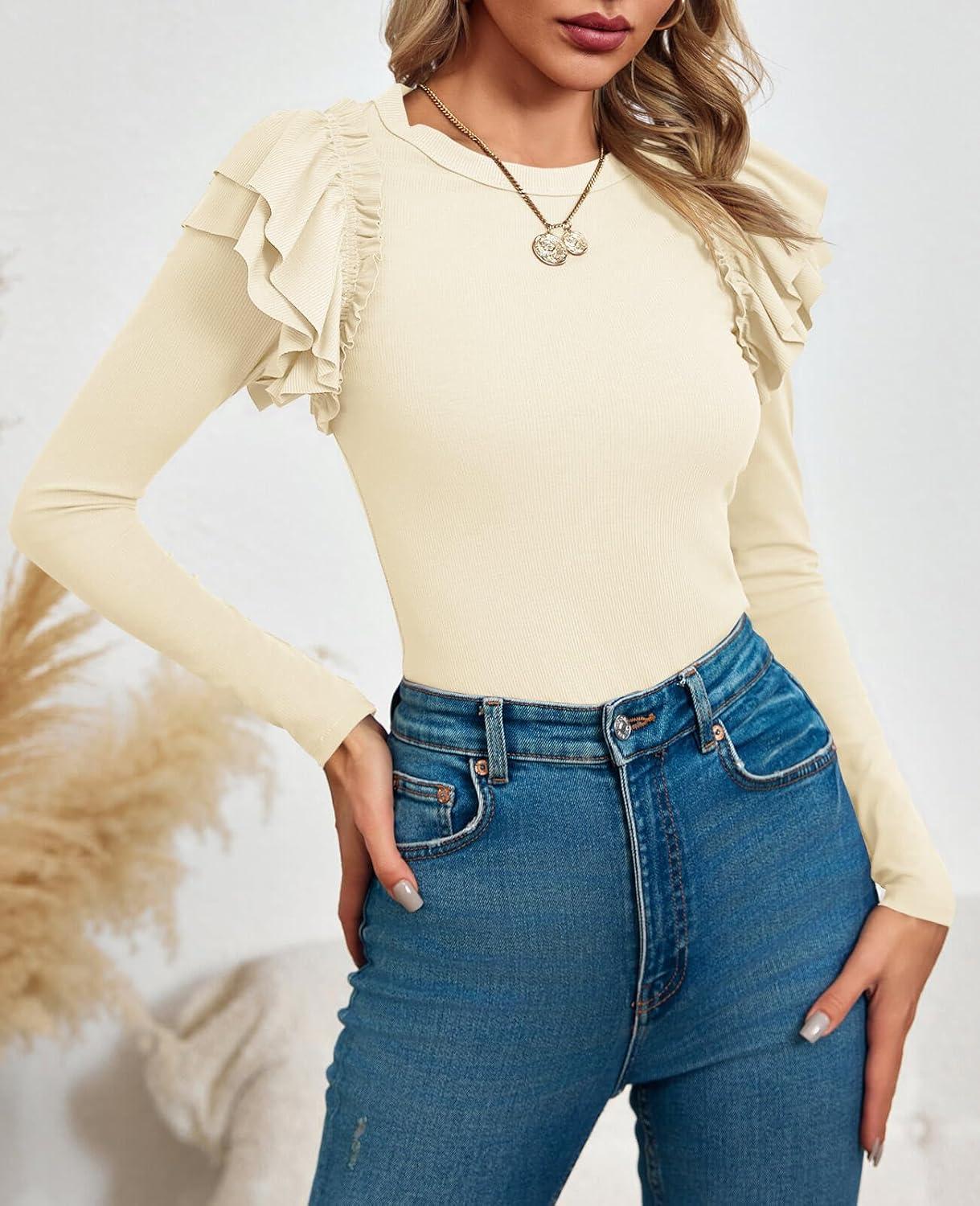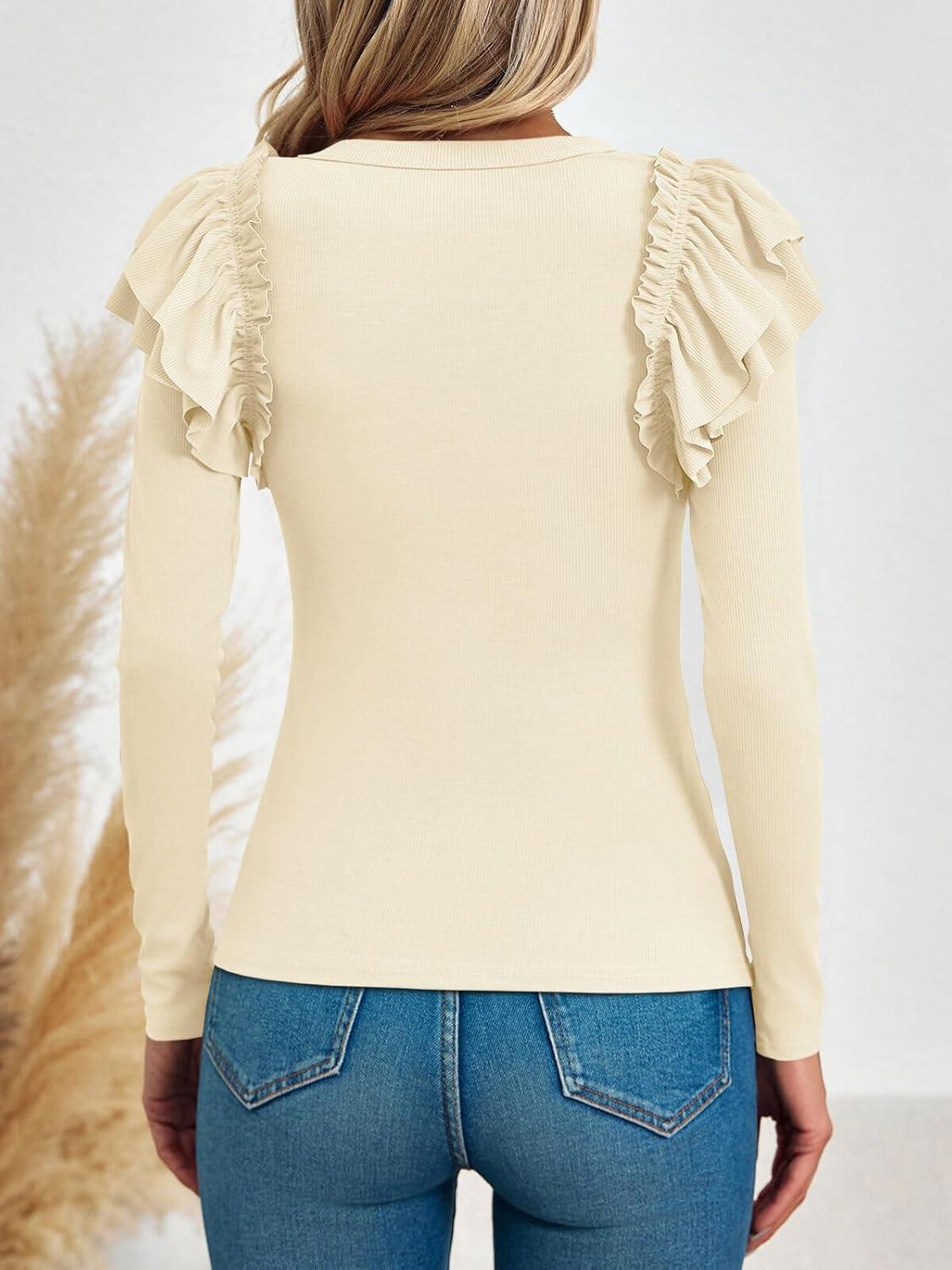 Tankaneo Womens Ruffle Long Sleeve Shirts Fitted Ribbed Knit Tops Fall Casual Crew Neck Tees(Beige)