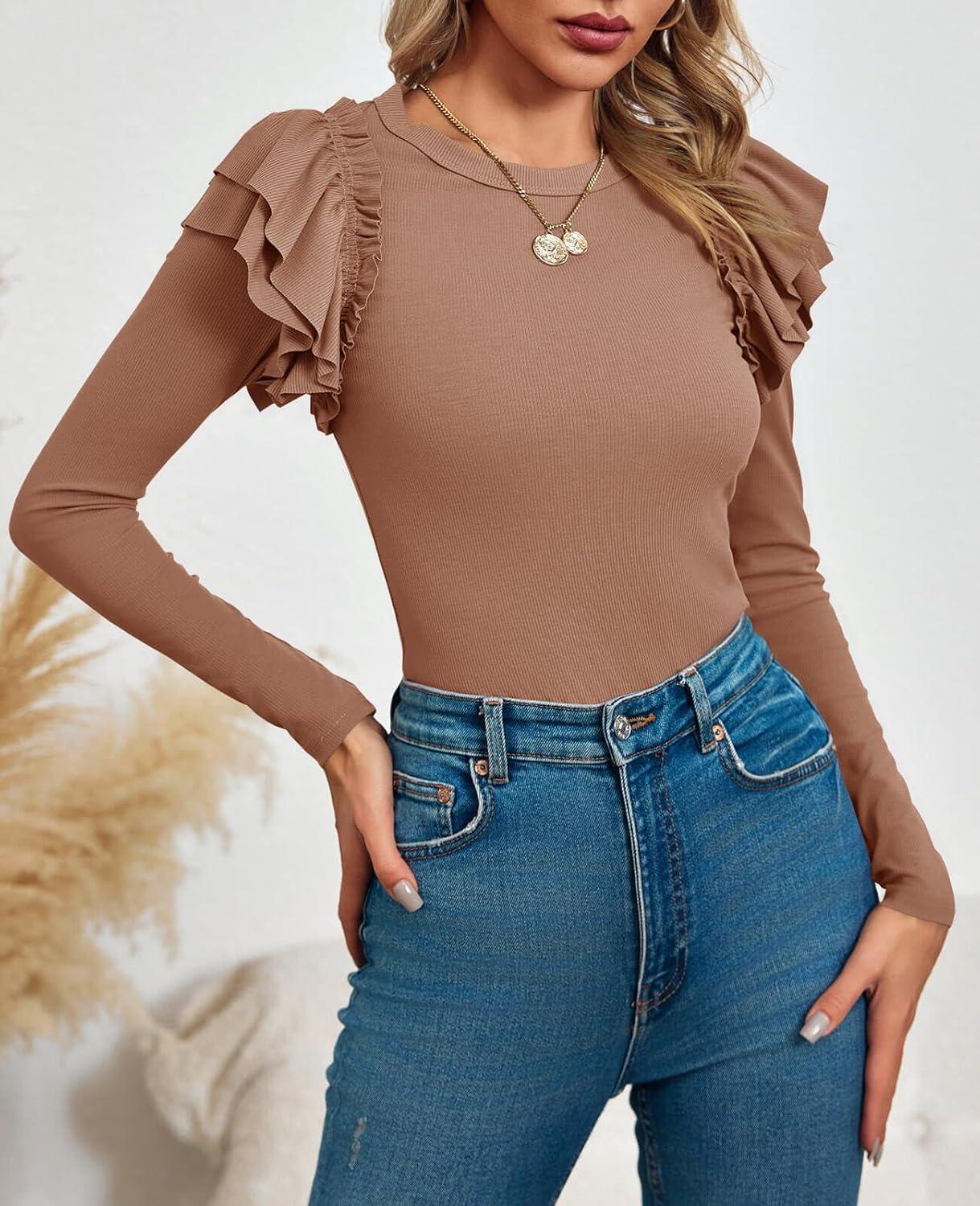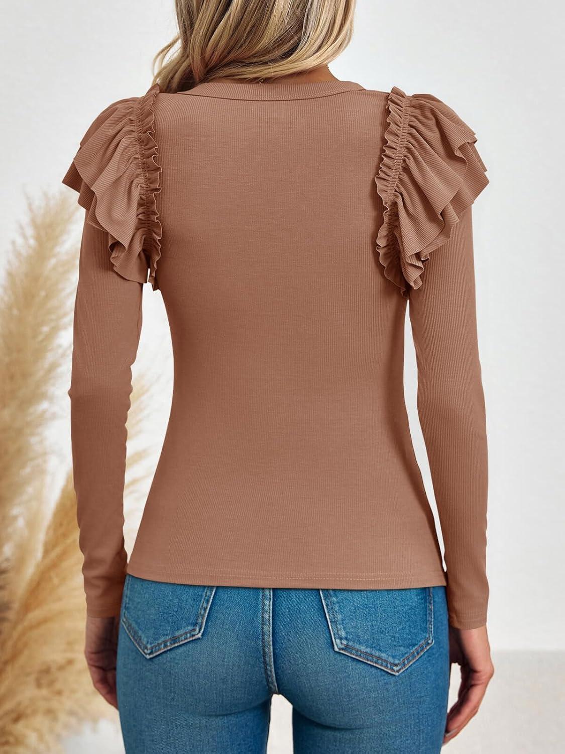Tankaneo Womens Ruffle Long Sleeve Shirts Fitted Ribbed Knit Tops Fall Casual Crew Neck Tees(Khaki)