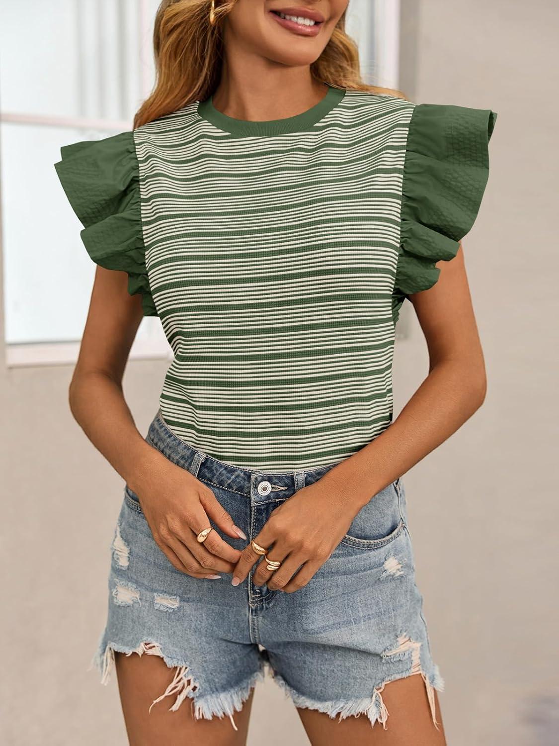 Tankaneo Womens Ruffle Striped Tank Tops Summer Crew Neck Sleeveless Shirts Loose Fit Dressy Casual Blouse(Army Green)