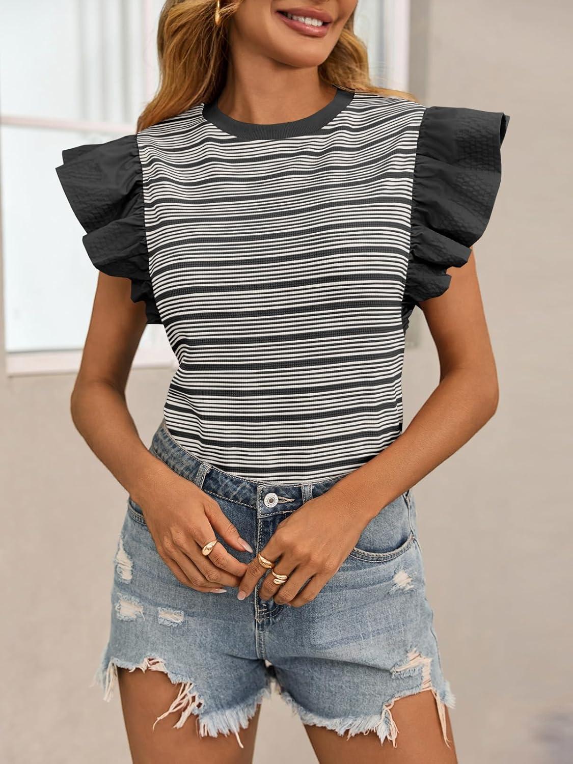 Tankaneo Womens Ruffle Striped Tank Tops Summer Crew Neck Sleeveless Shirts Loose Fit Dressy Casual Blouse(Black)