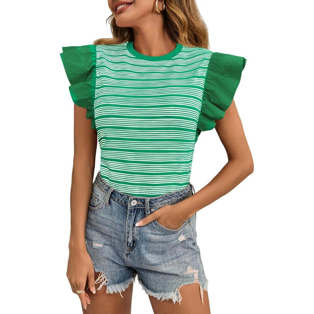 Tankaneo Womens Ruffle Striped Tank Tops Summer Crew Neck Sleeveless Shirts Loose Fit Dressy Casual Blouse(Green)