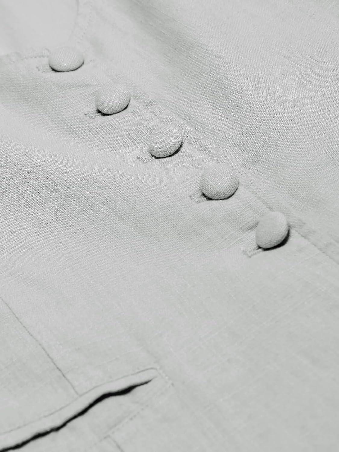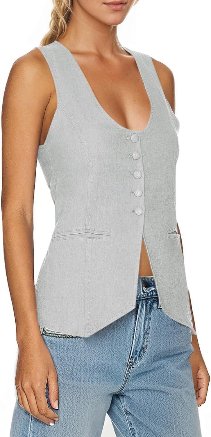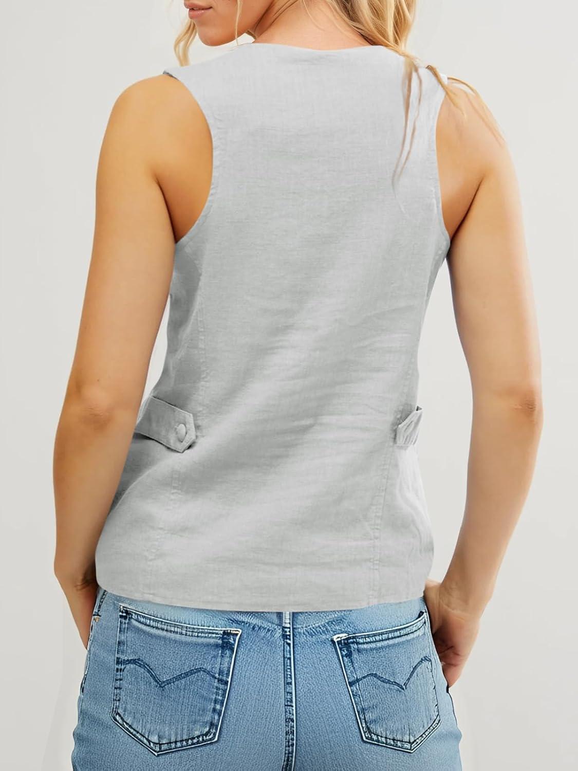 Tankaneo Womens Scoop Neck Blazer Vest Summer Linen Sleeveless Fitted Waistcoat Work Casual Cotton Suit Tops(Light Grey)