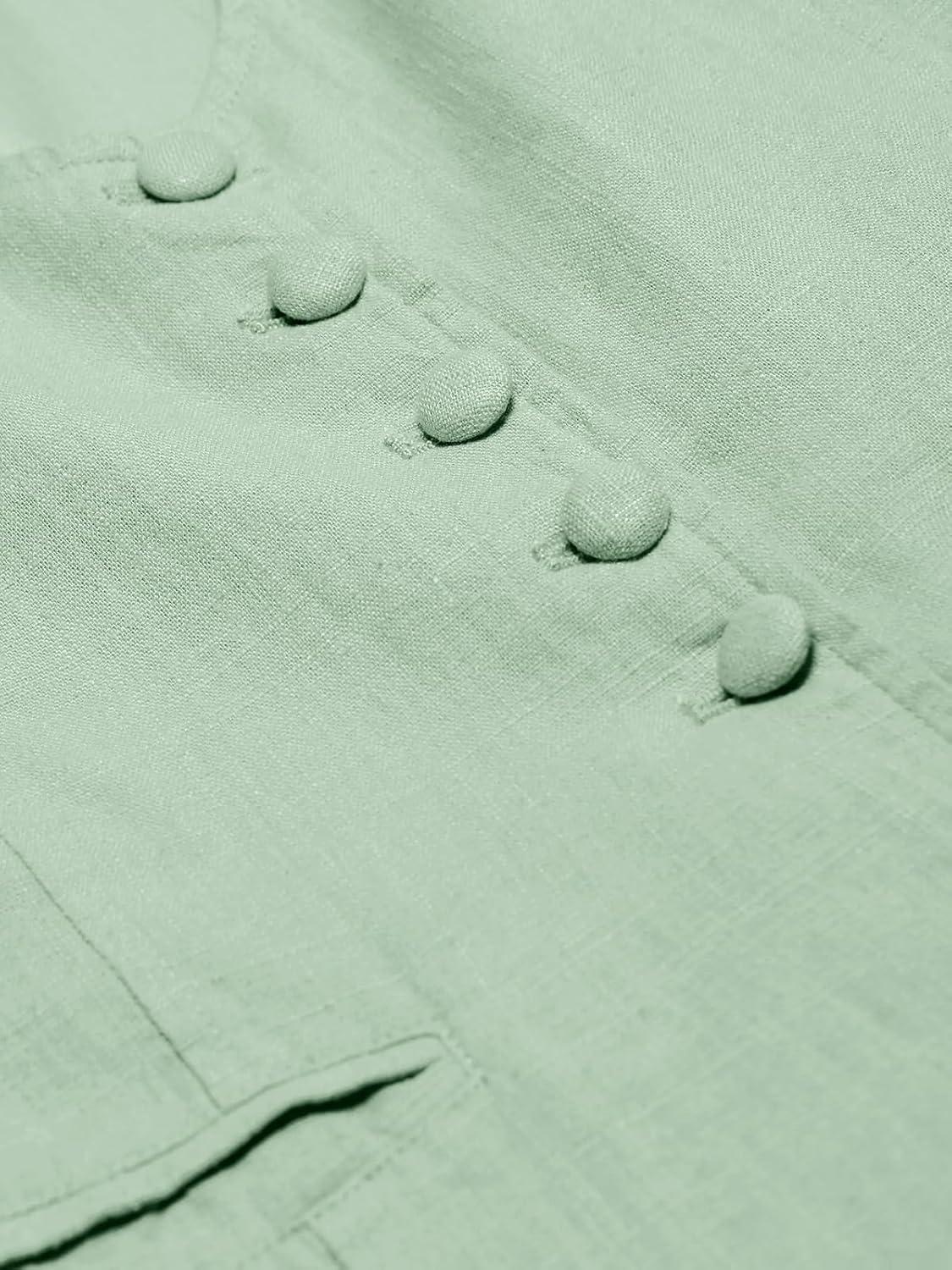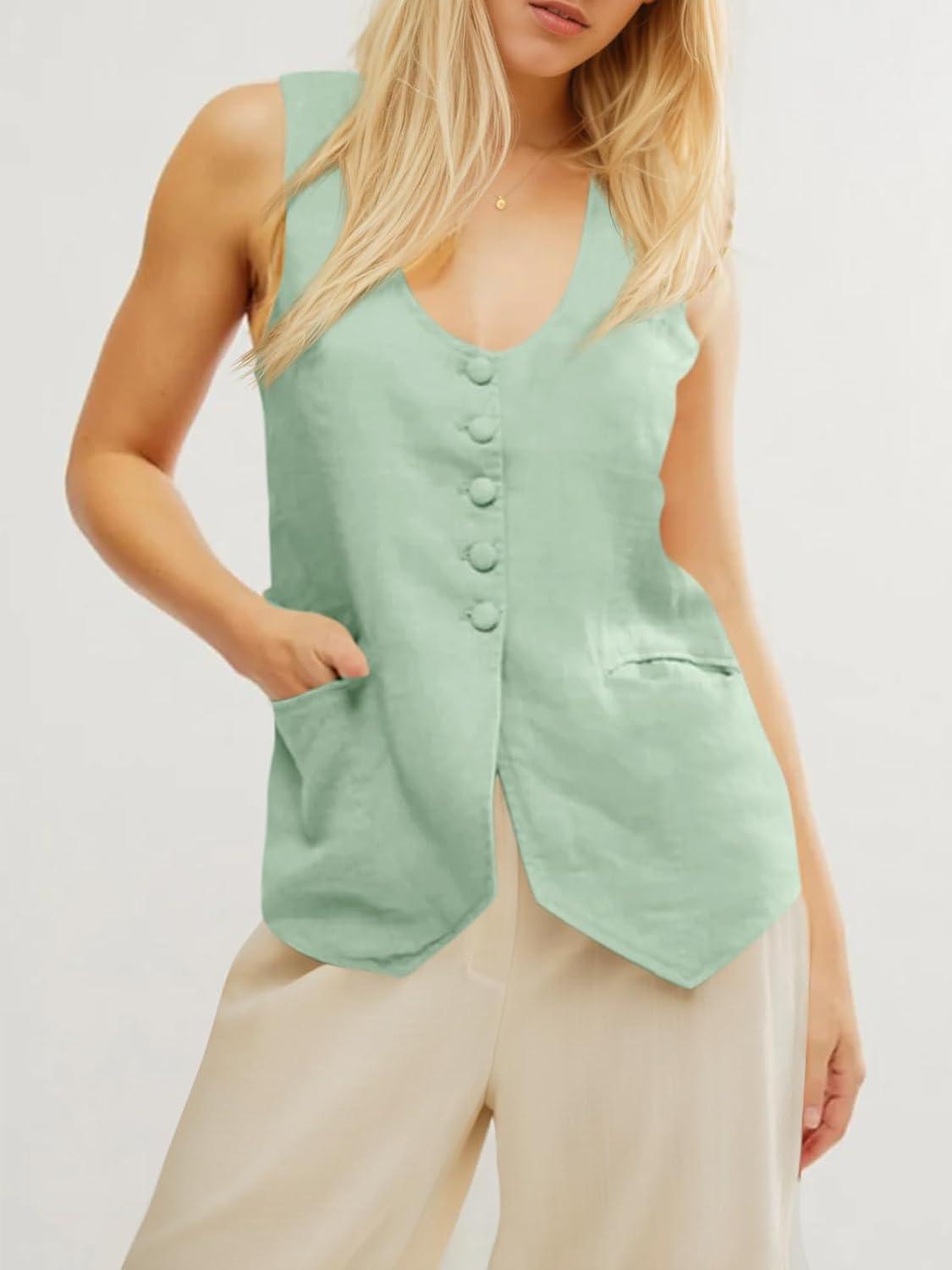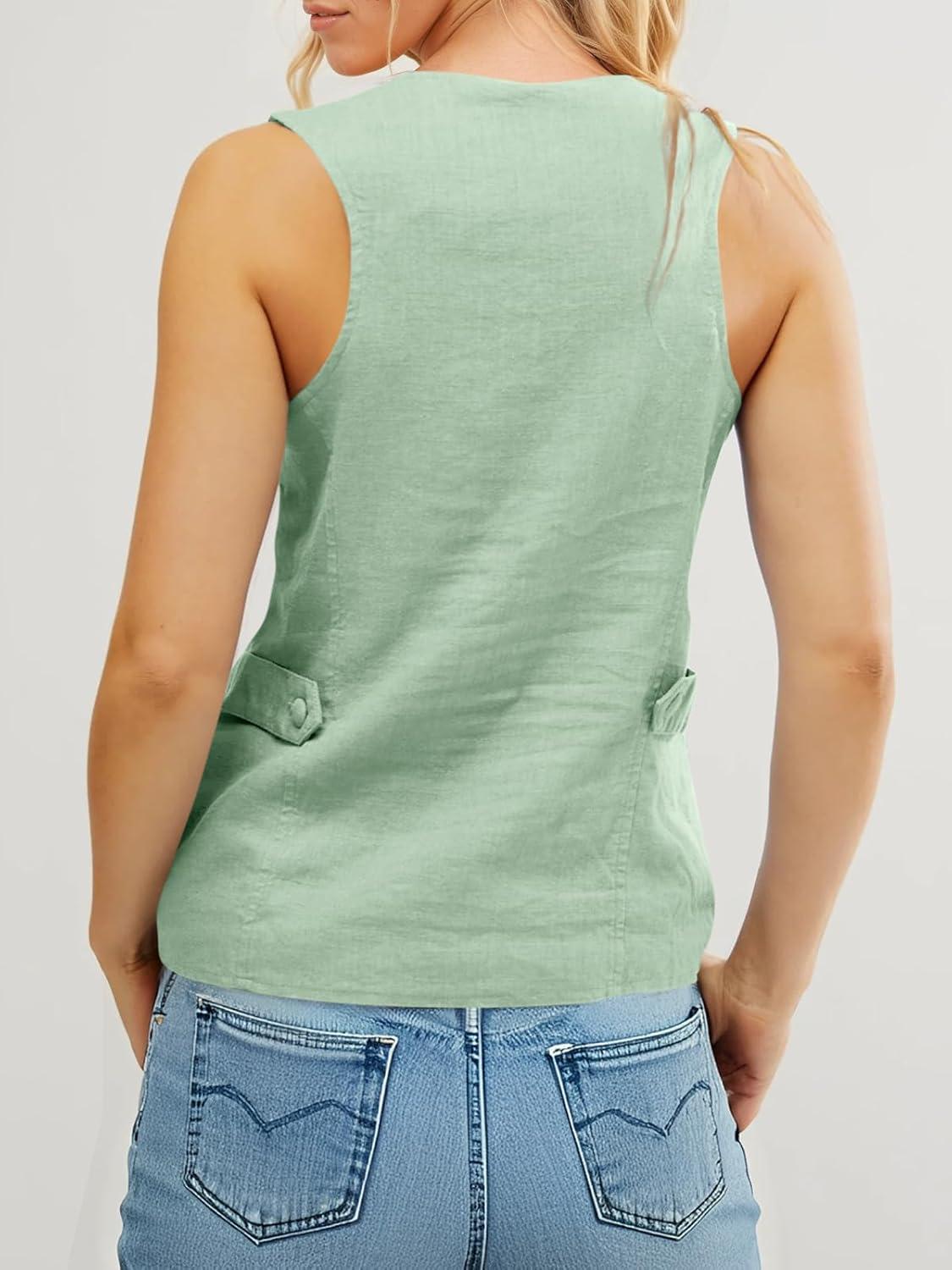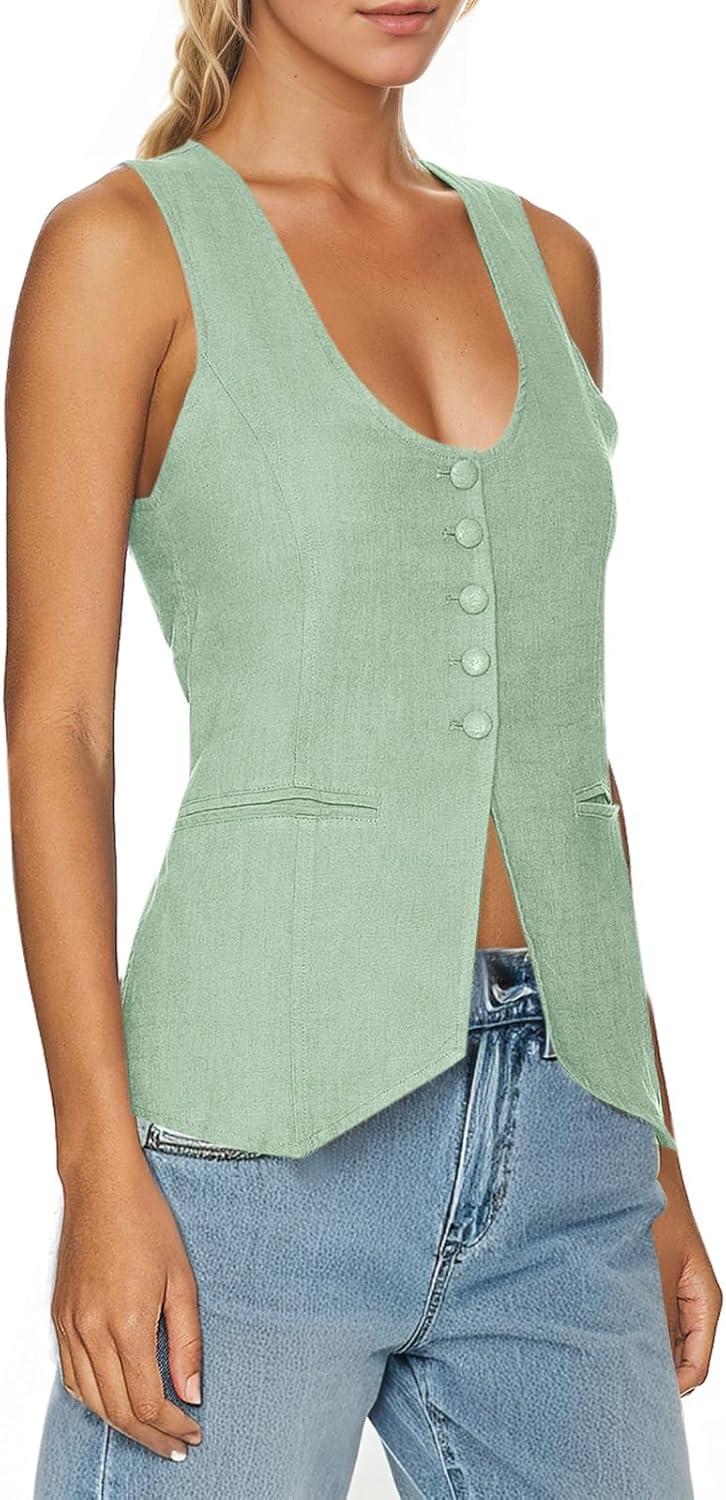 Tankaneo Womens Scoop Neck Blazer Vest Summer Linen Sleeveless Fitted Waistcoat Work Casual Cotton Suit Tops(Mint)