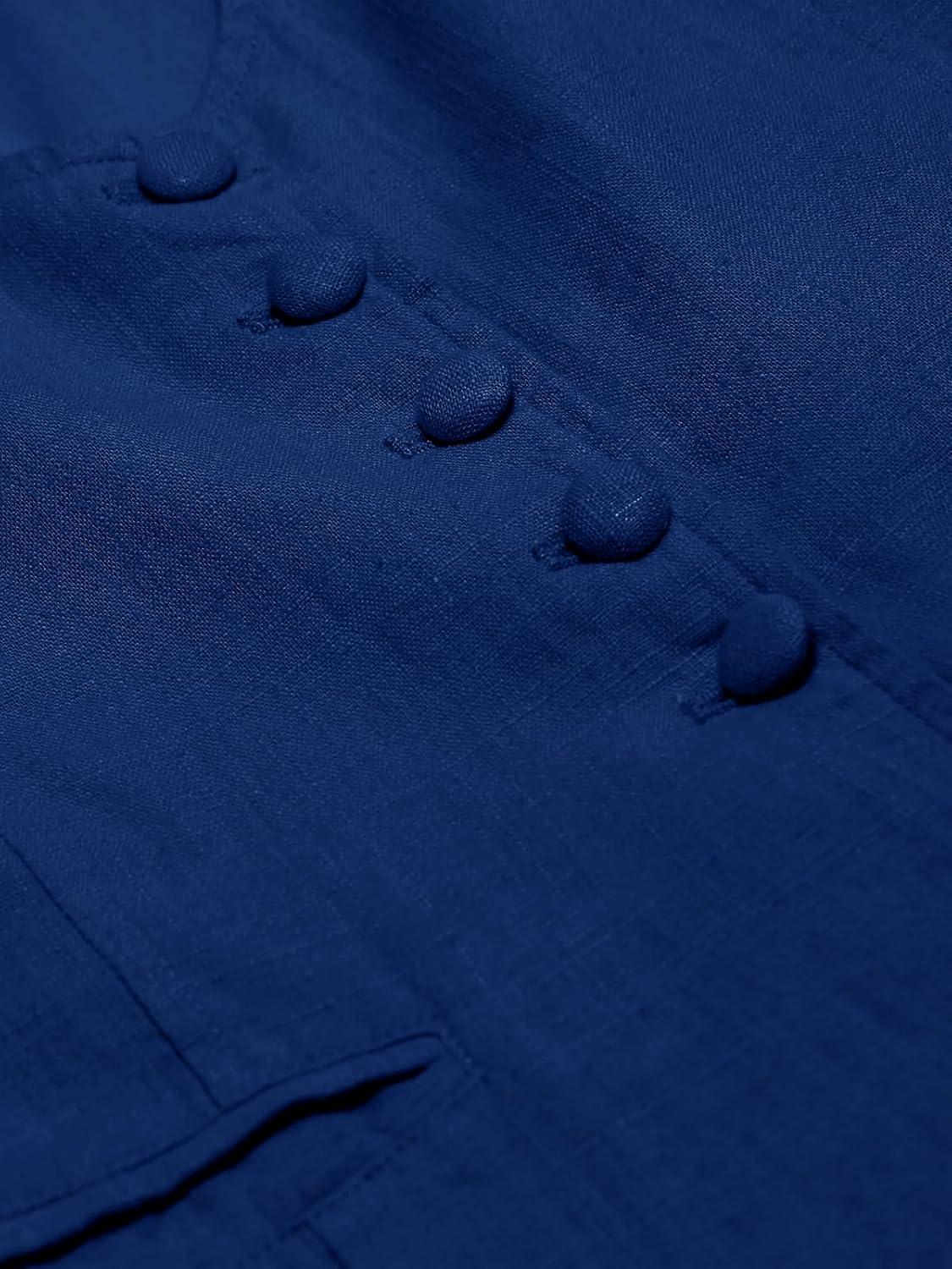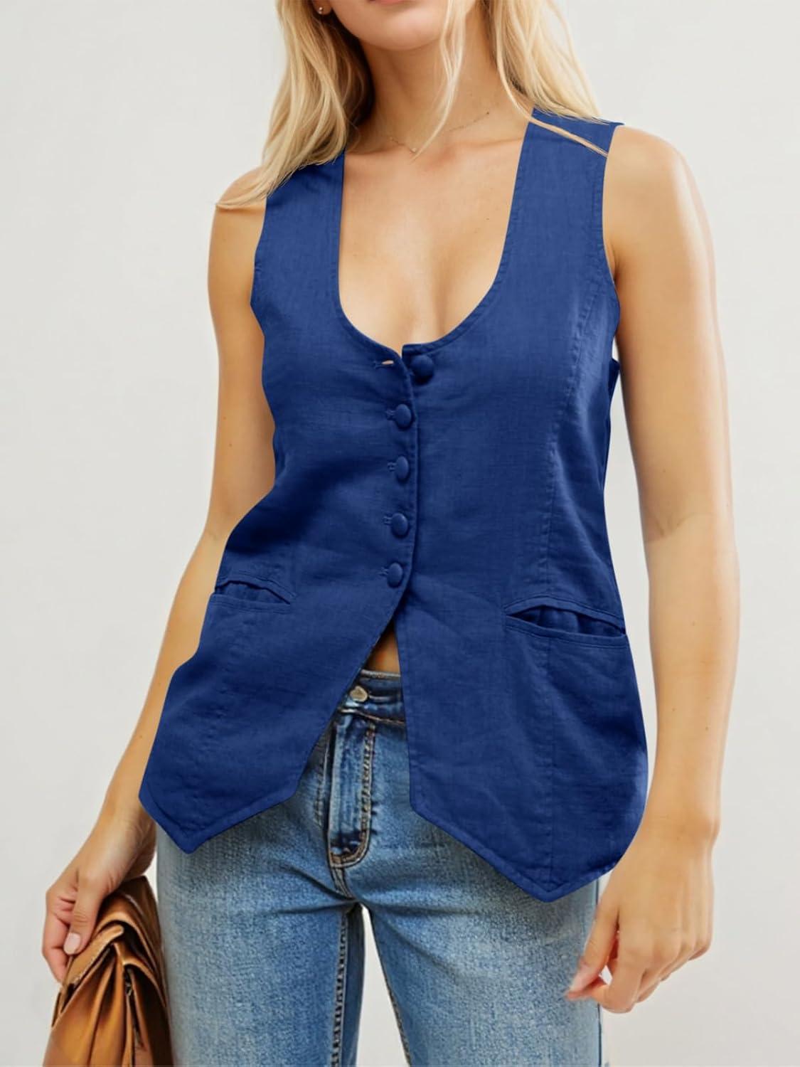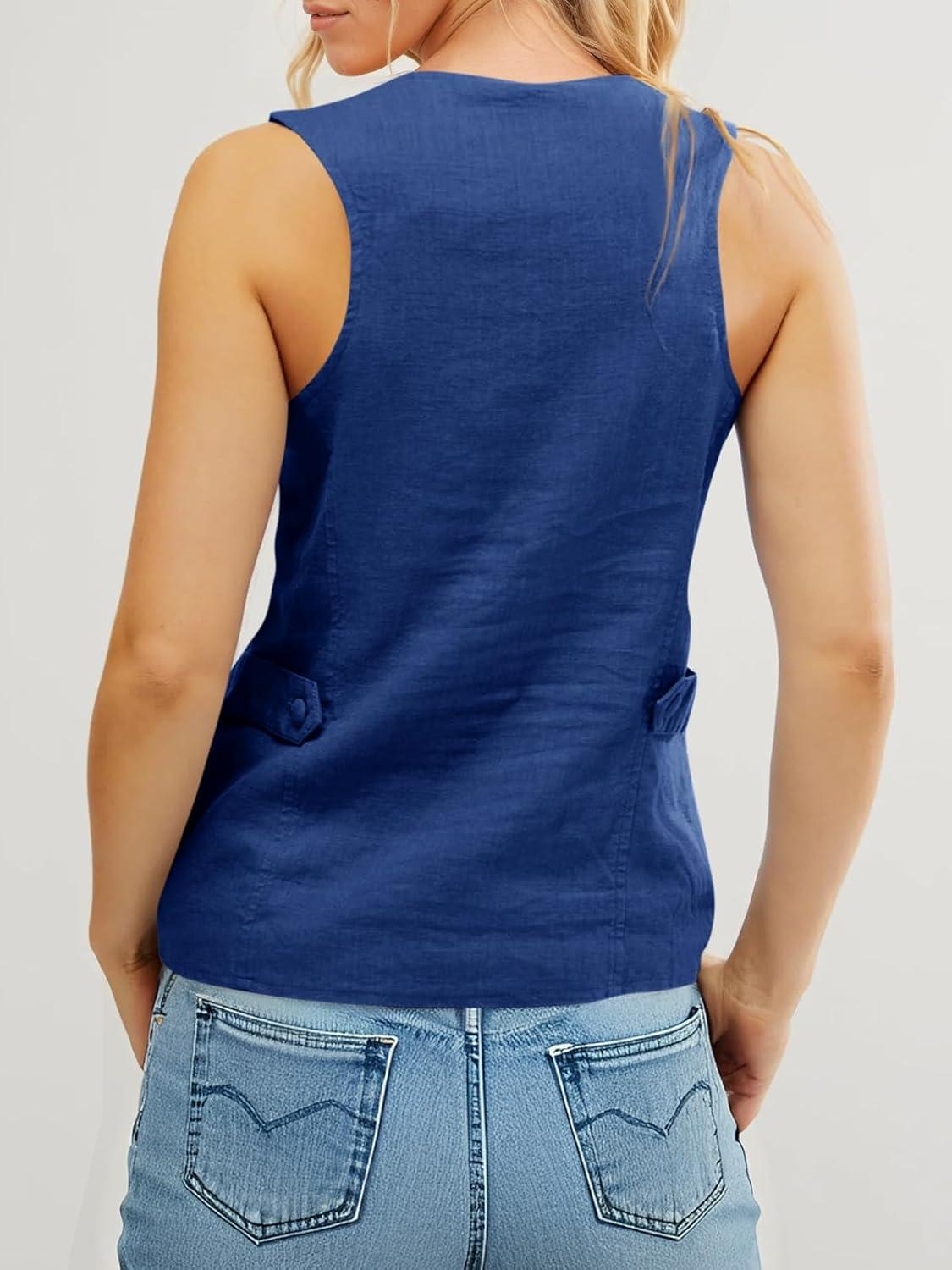 Tankaneo Womens Scoop Neck Blazer Vest Summer Linen Sleeveless Fitted Waistcoat Work Casual Cotton Suit Tops(Navy)