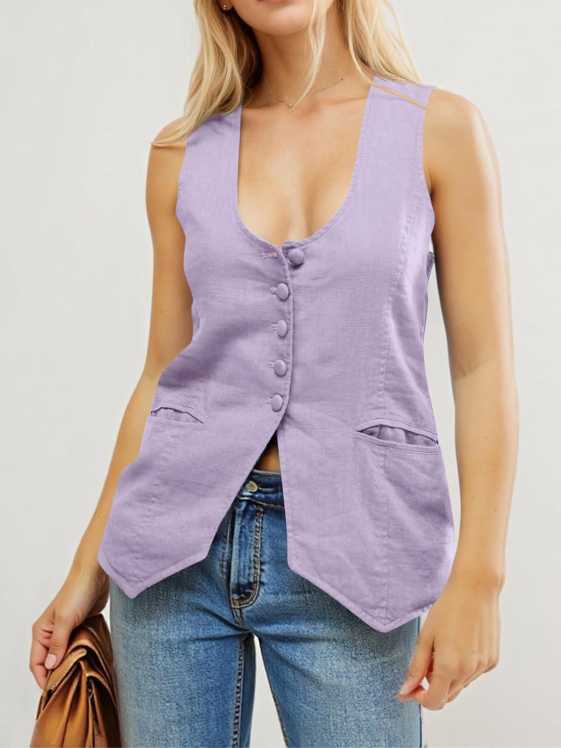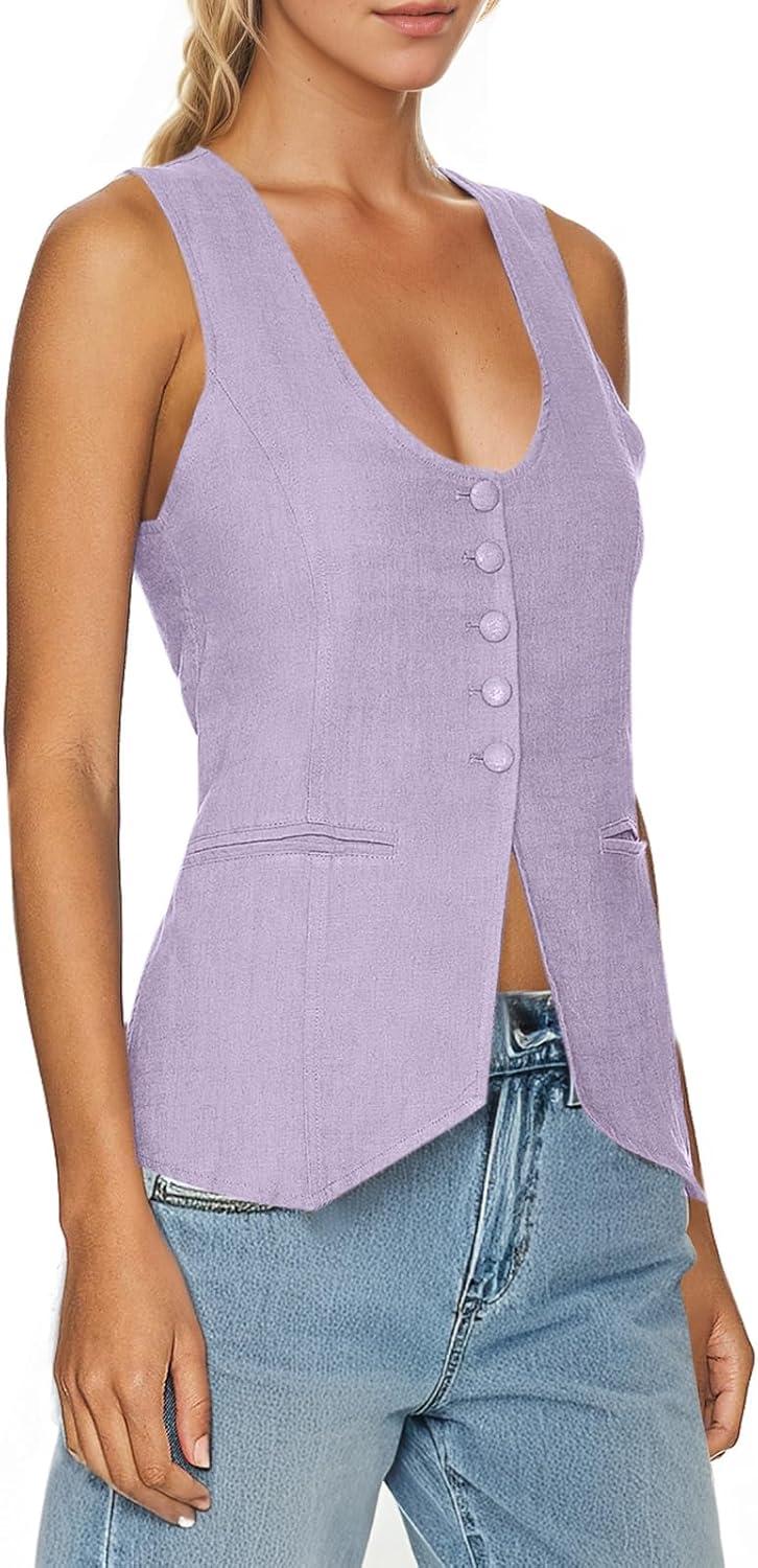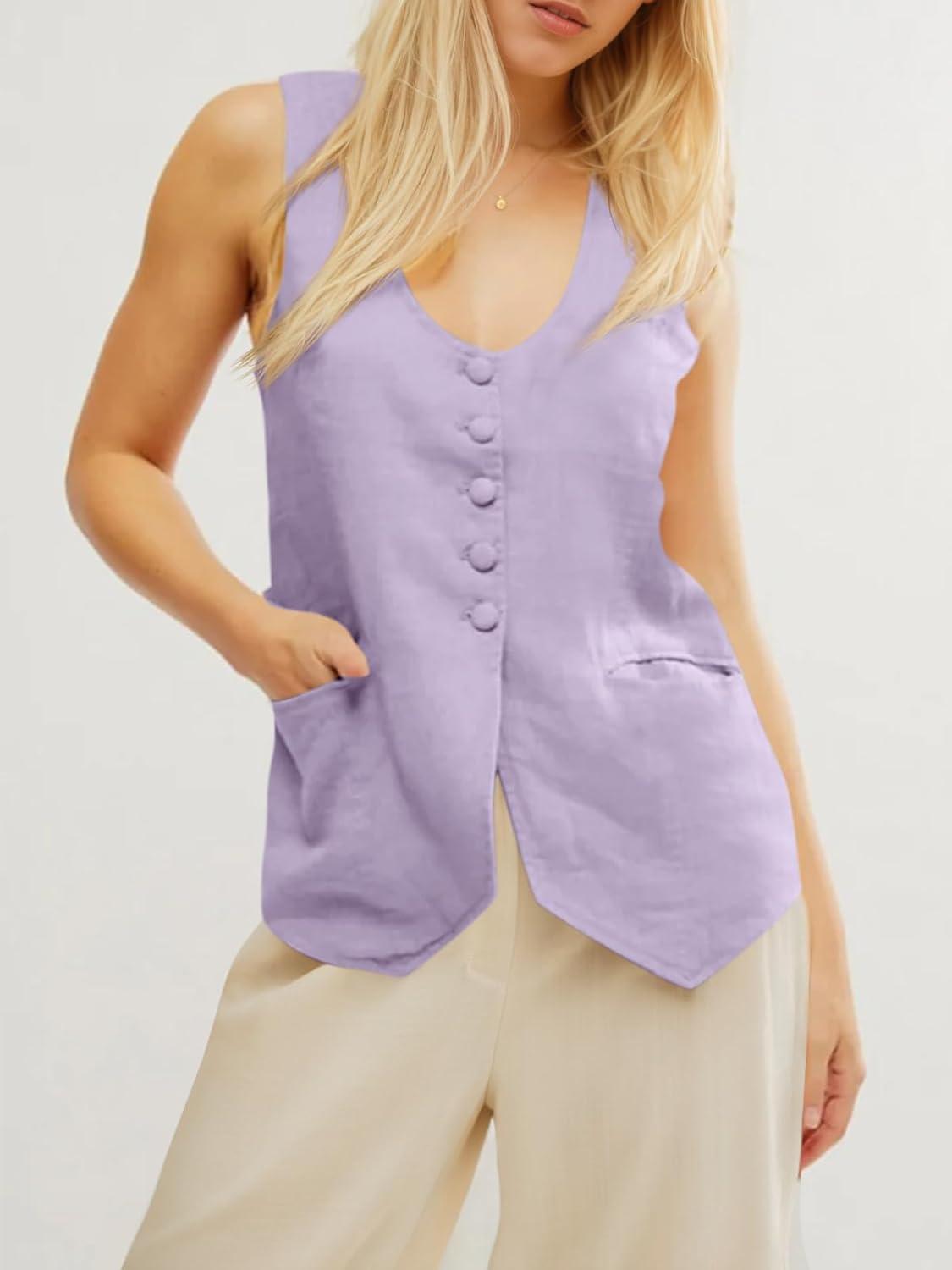 Tankaneo Womens Scoop Neck Blazer Vest Summer Linen Sleeveless Fitted Waistcoat Work Casual Cotton Suit Tops(Purple)