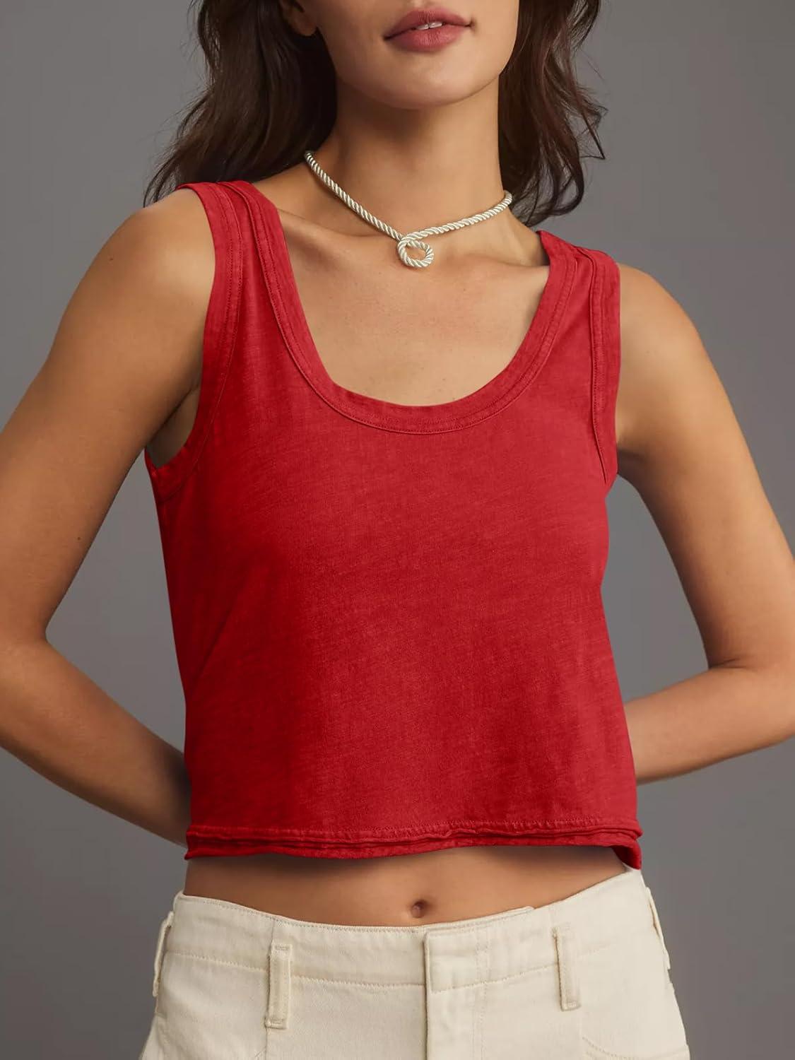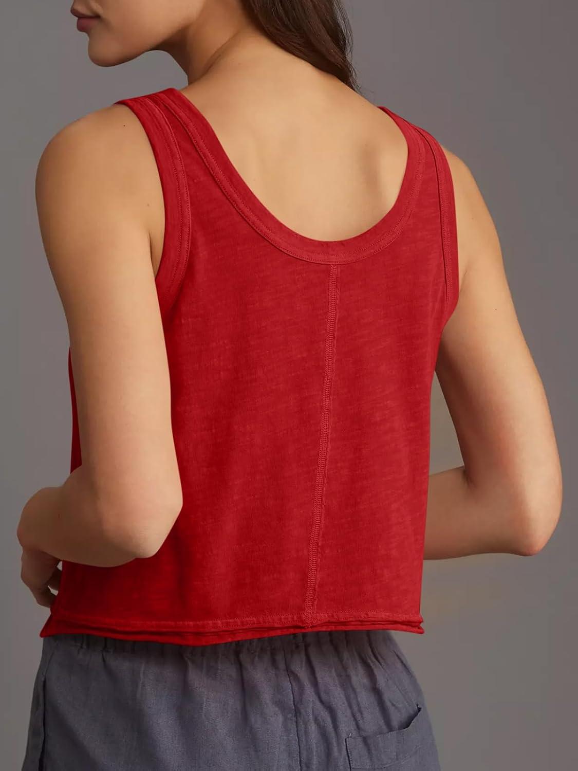 Tankaneo Womens Scoop Neck Cropped Tank Tops Summer Casual Cotton Workout Sleeveless Shirts Loose Fit Basic Tee(Red)