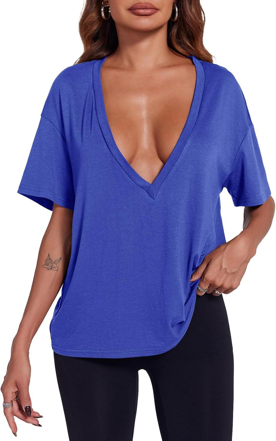 Tankaneo Womens Sexy Deep V Neck T-Shirts Summer Short Sleeve Tops Casual Loose Fit Basic Tees(Dark Blue)