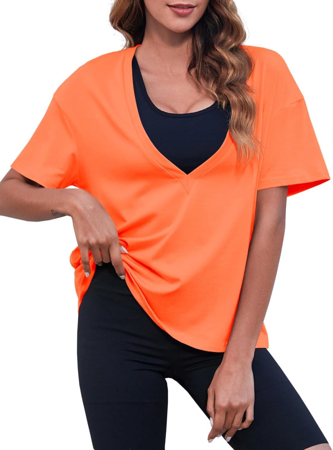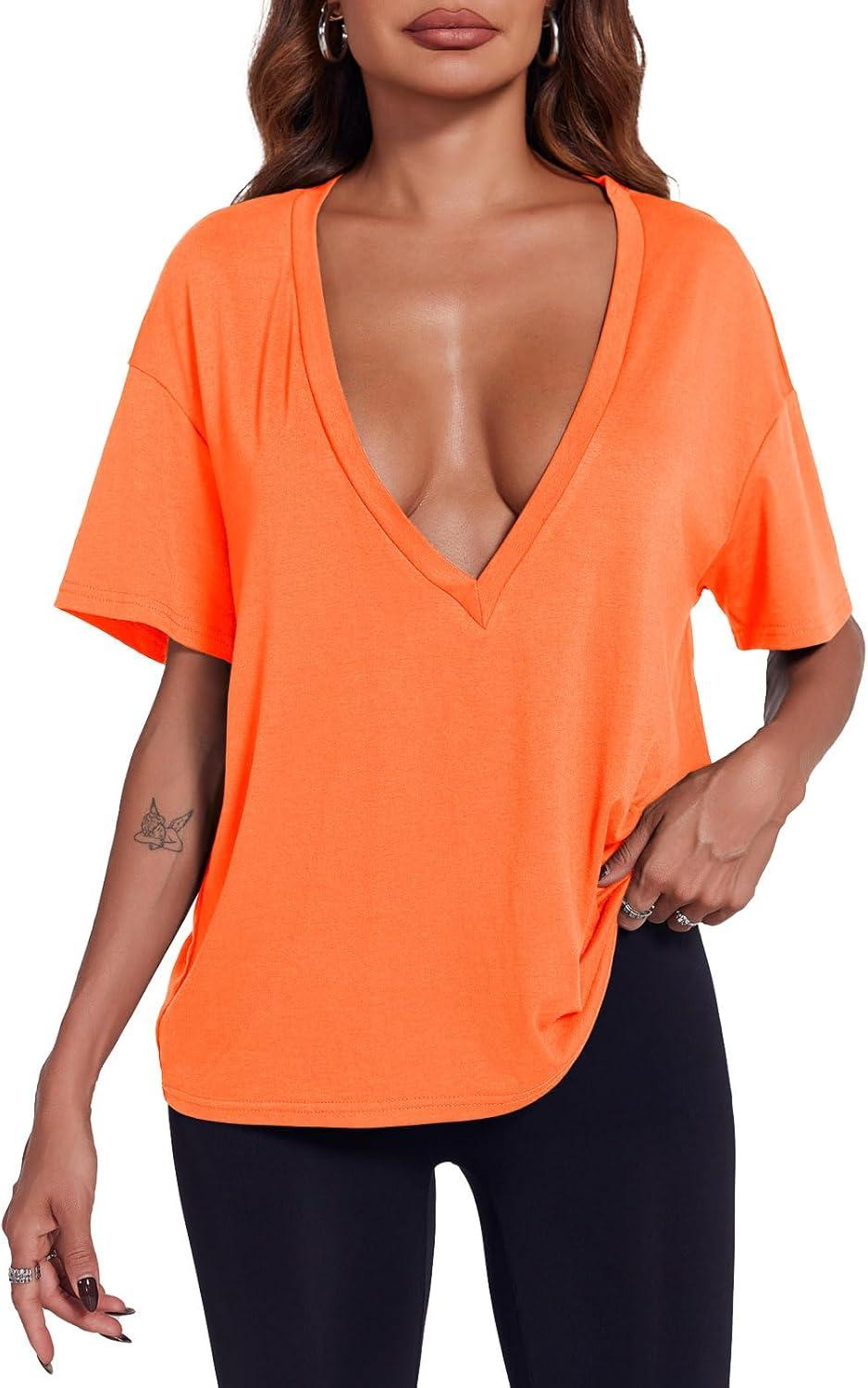 Tankaneo Womens Sexy Deep V Neck T-Shirts Summer Short Sleeve Tops Casual Loose Fit Basic Tees(Orange)