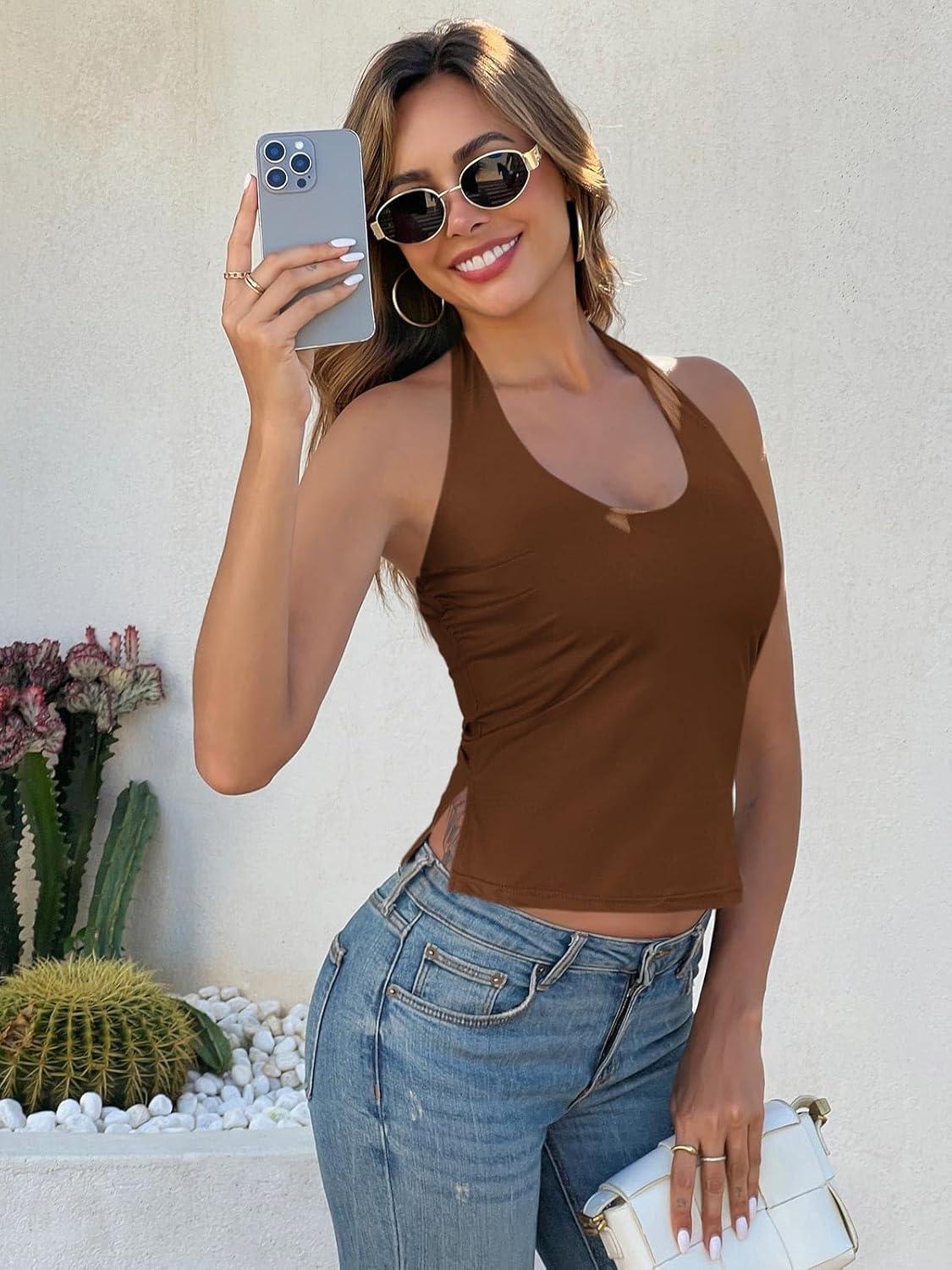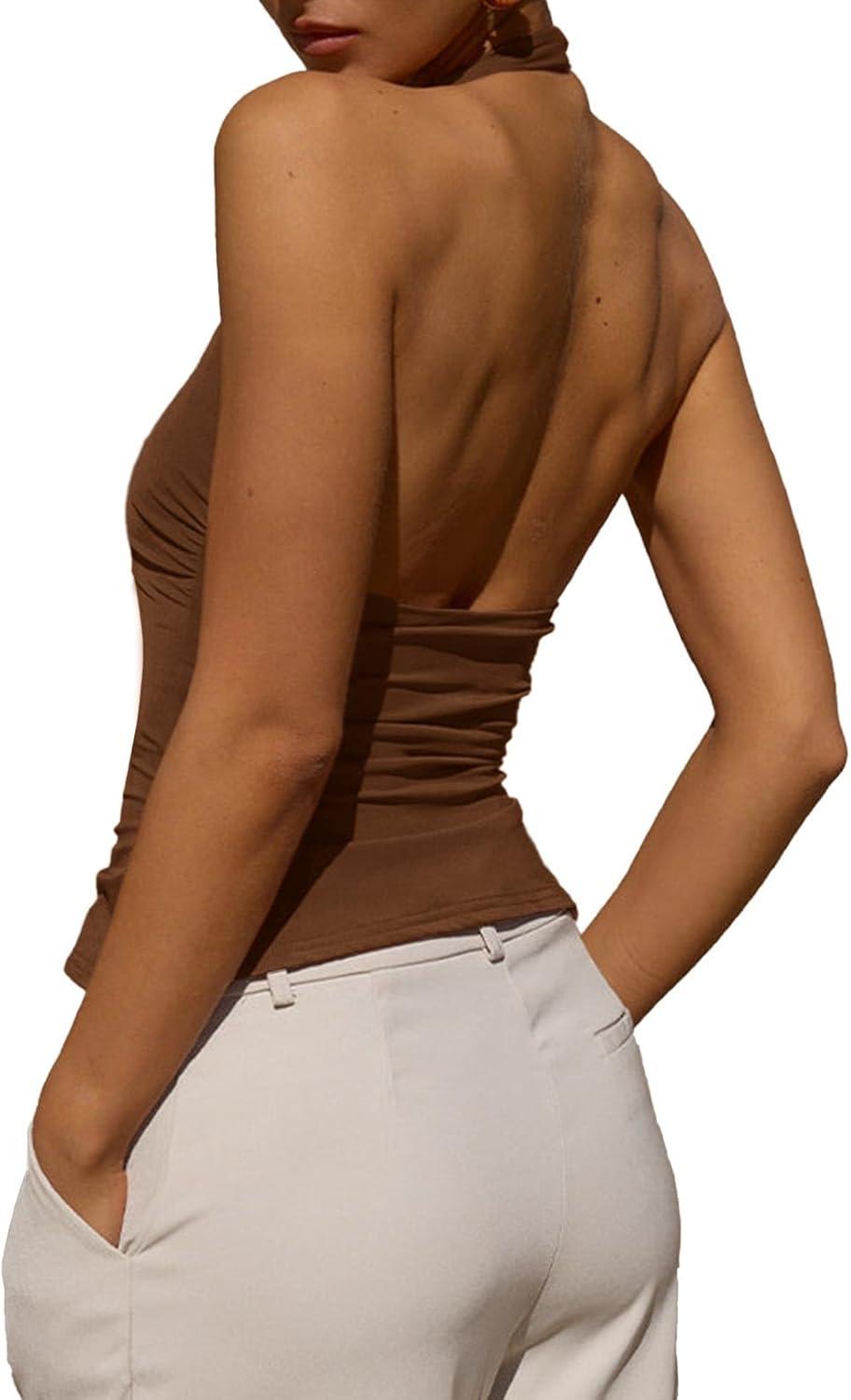 Tankaneo Womens Sexy Scoop Neck Halter Tops Backless Ruched Knit Tank Tops Summer Sleeveless Fitted Going Out Shirts(Brown)