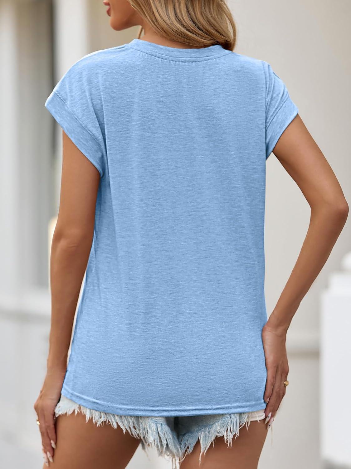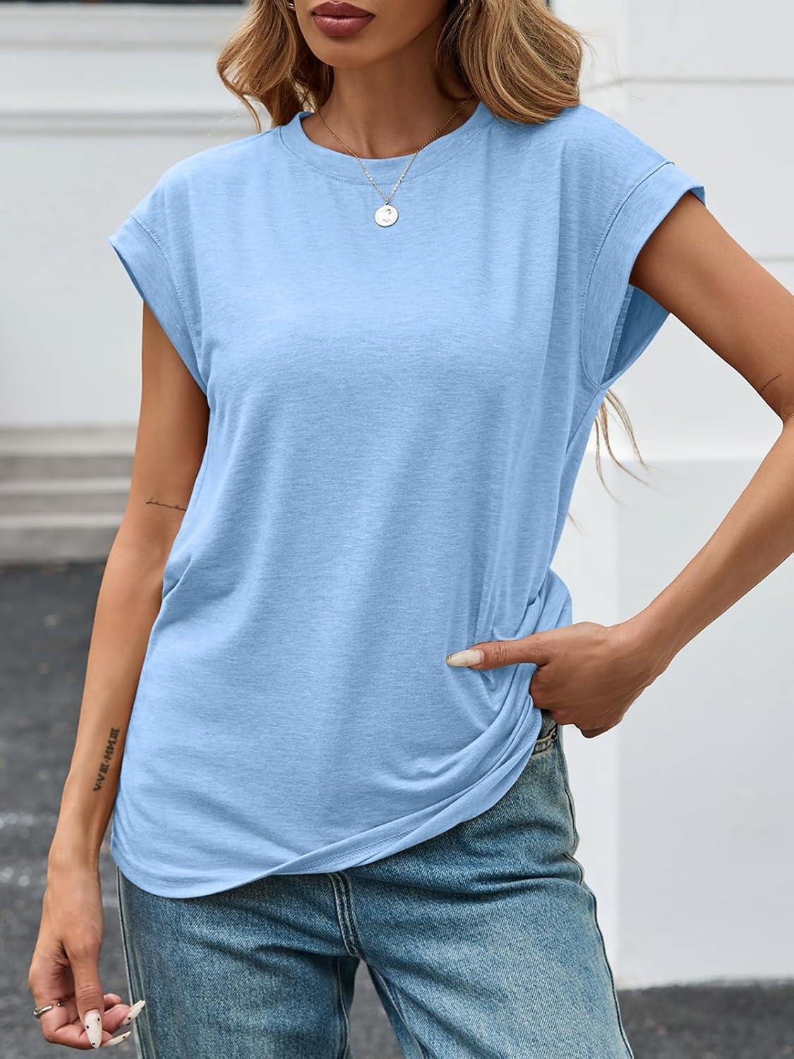 Tankaneo Womens Short Cap Sleeve Tops Crew Neck Loose Fit T Shirt Basic Casual Sleeveless Tee Shirts(Sky Blue)