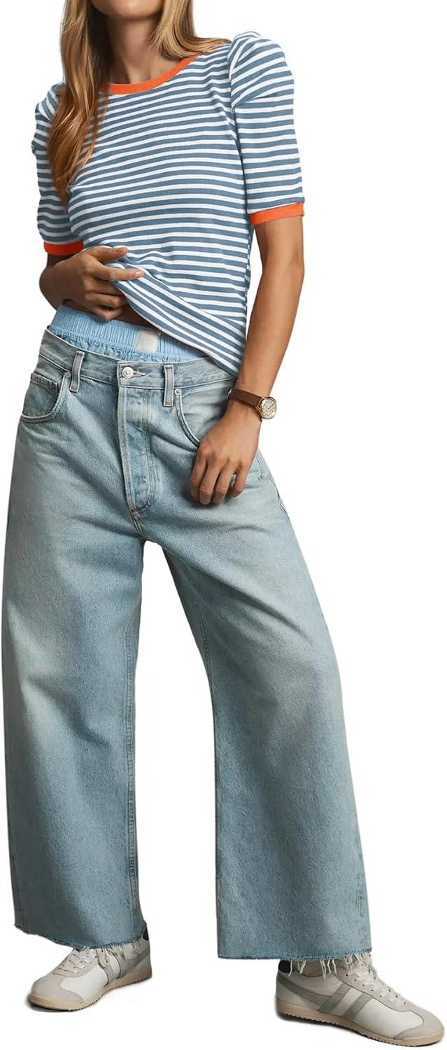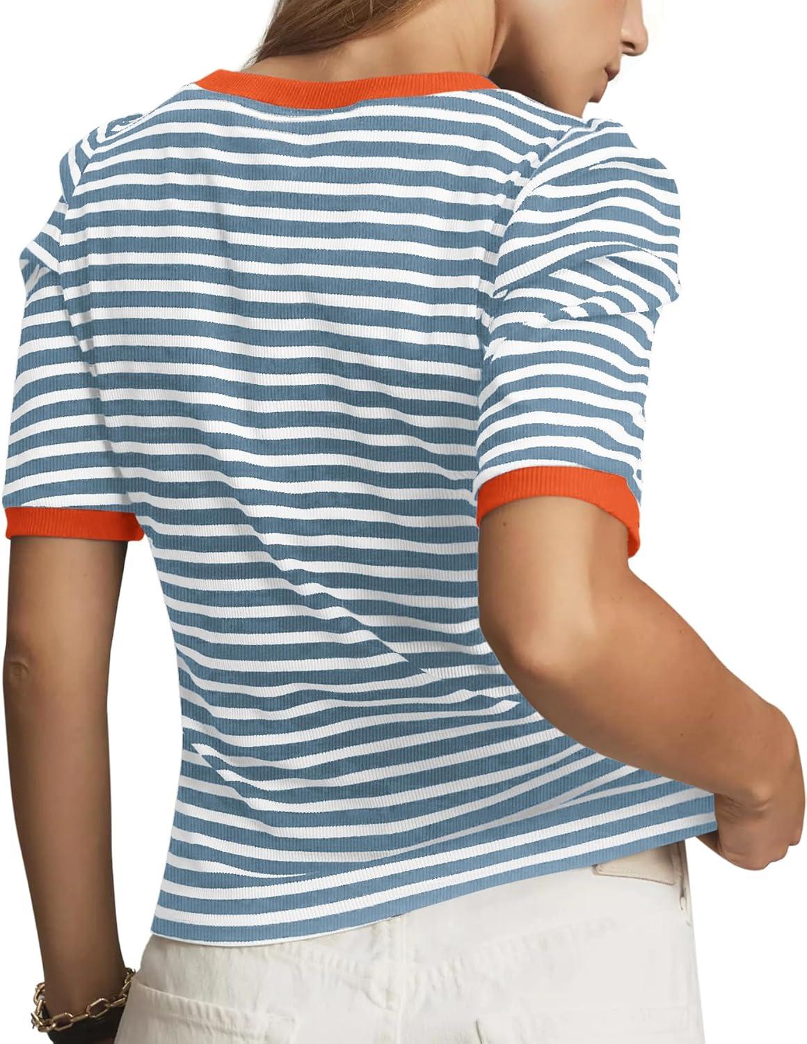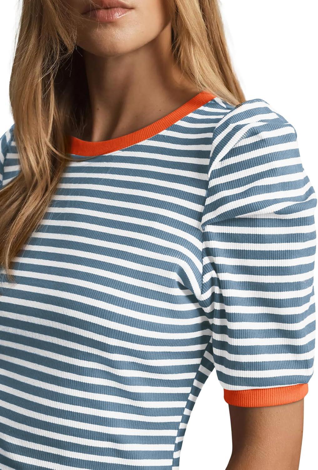 Tankaneo Womens Short Puff Sleeve Tops Trendy Striped Color Block T Shirts Crewneck Casual Shirts(Blue White)