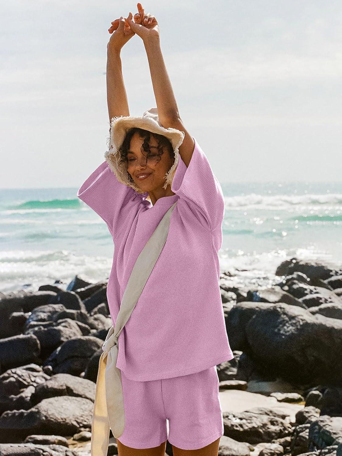 Tankaneo Womens Short Sets 2 Piece Outfits 3/4 Sleeve Tops and Elastic Waist Shorts Lounge Set Casual Loungewear(Pink)