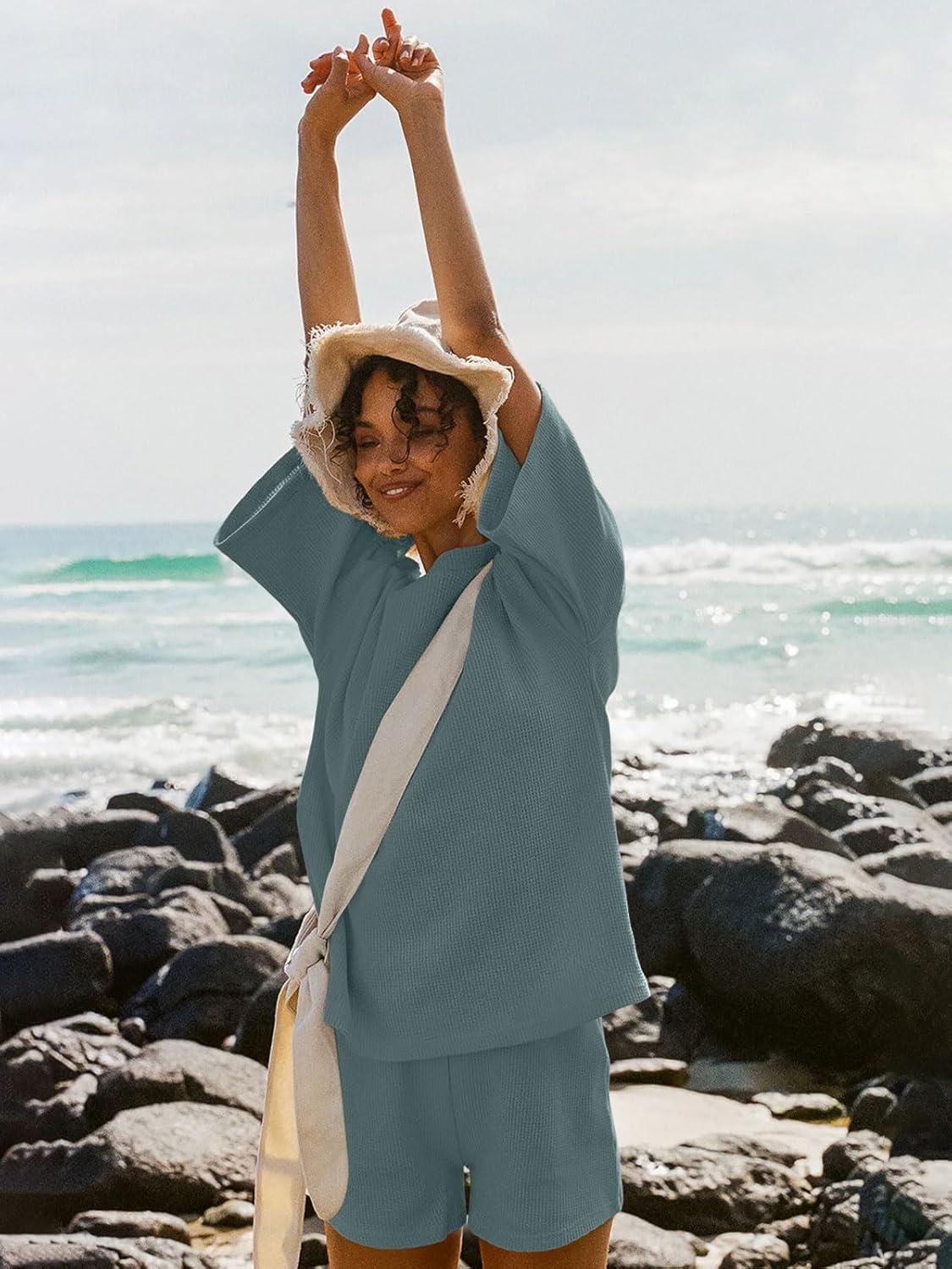 Tankaneo Womens Short Sets 2 Piece Outfits 3/4 Sleeve Tops and Elastic Waist Shorts Lounge Set Casual Loungewear(Sea Blue)