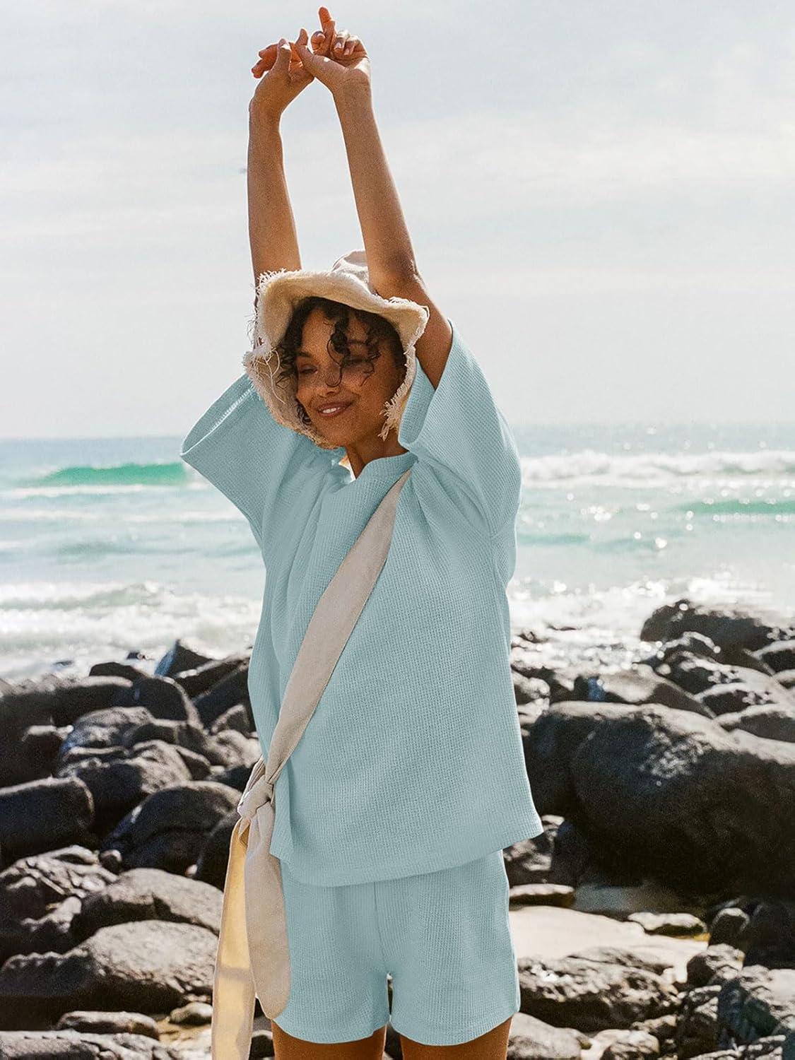 Tankaneo Womens Short Sets 2 Piece Outfits 3/4 Sleeve Tops and Elastic Waist Shorts Lounge Set Casual Loungewear(Sky Blue)
