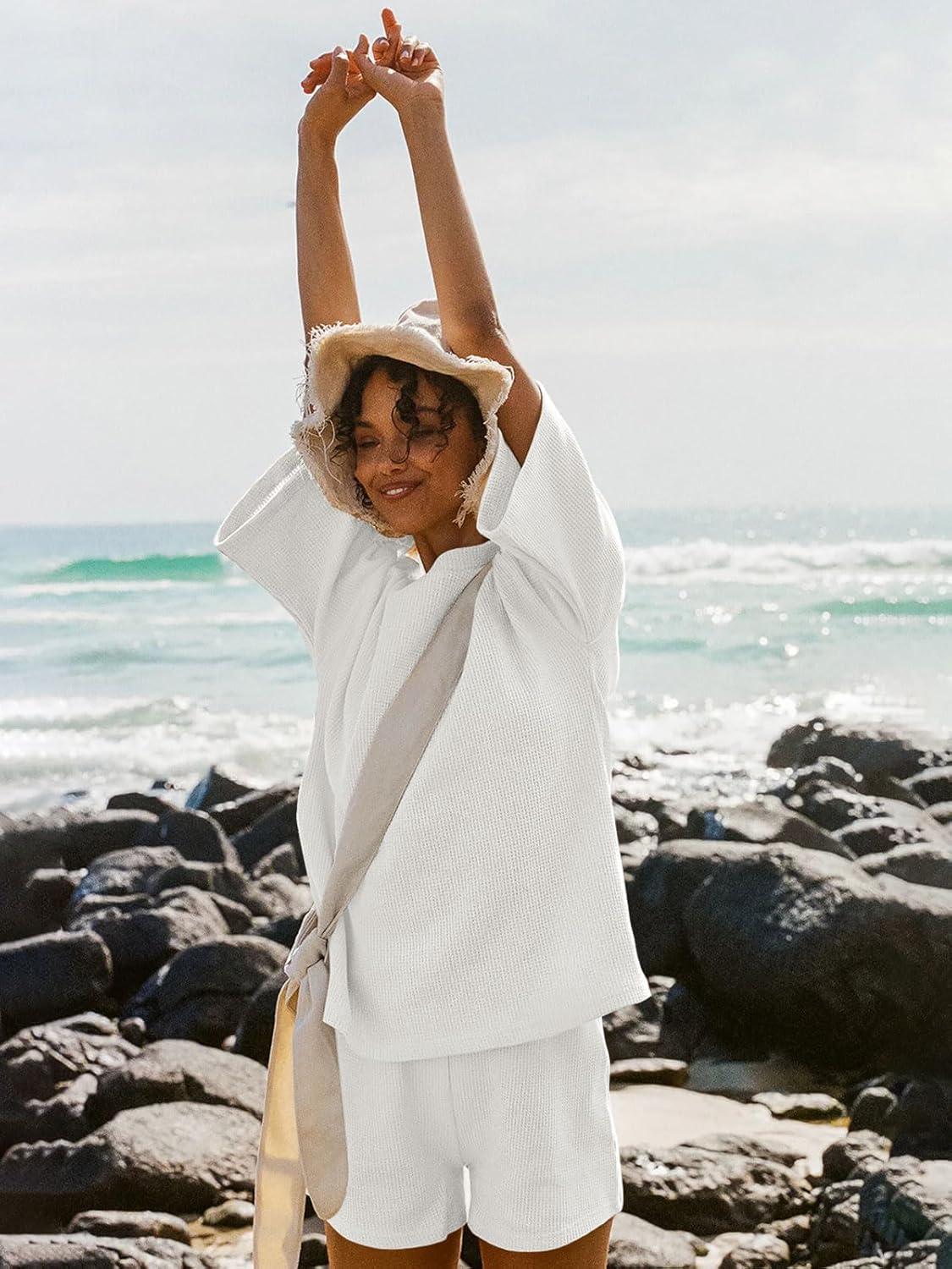Tankaneo Womens Short Sets 2 Piece Outfits 3/4 Sleeve Tops and Elastic Waist Shorts Lounge Set Casual Loungewear(White)