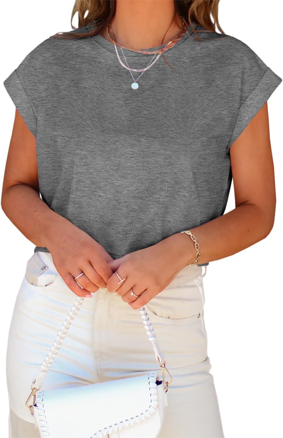 Tankaneo Womens Short Sleeve Cropped T-Shirts Summer Rolled Dolman Sleeve Crop Tops Casual Round Neck Solid Short Basic Tees(05-grey)
