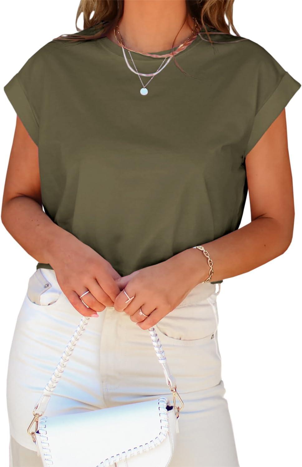 Tankaneo Womens Short Sleeve Cropped T-Shirts Summer Rolled Dolman Sleeve Crop Tops Casual Round Neck Solid Short Basic Tees(06-army Green)