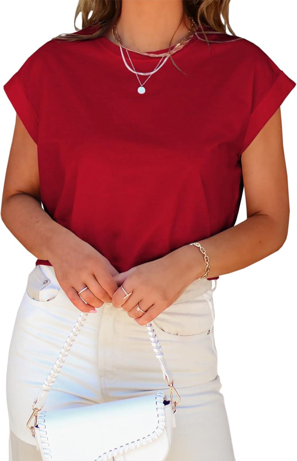 Tankaneo Womens Short Sleeve Cropped T-Shirts Summer Rolled Dolman Sleeve Crop Tops Casual Round Neck Solid Short Basic Tees(18-red)