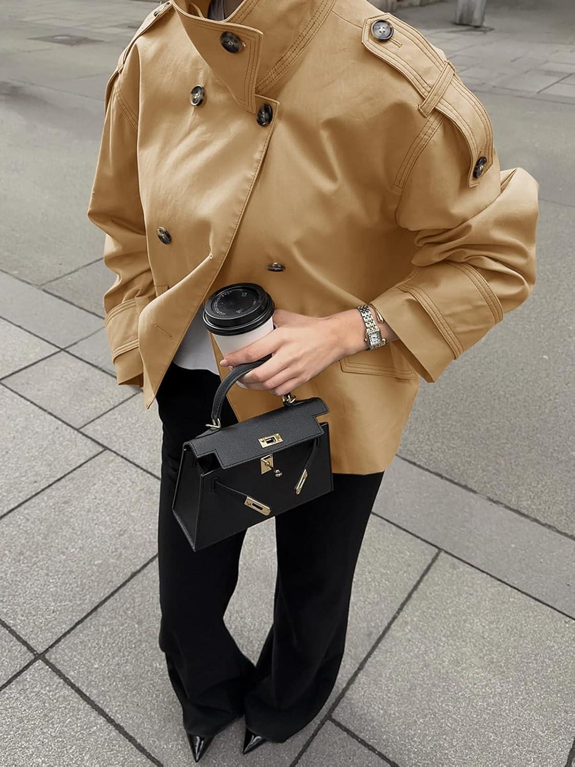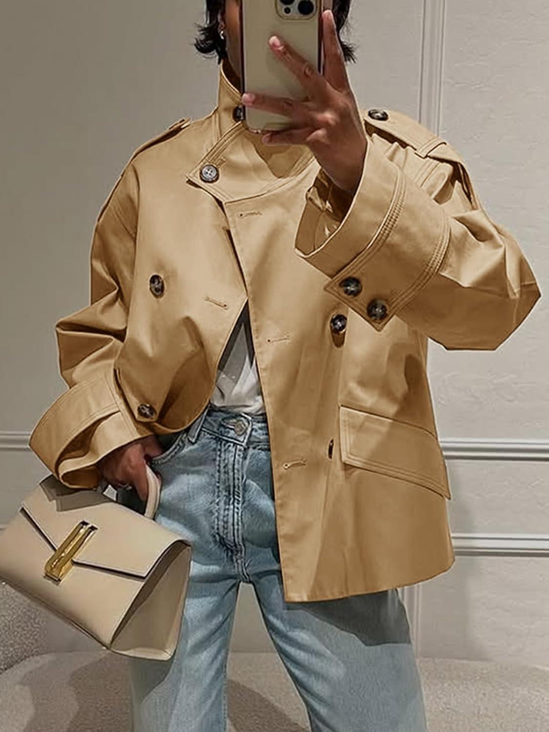 Tankaneo Womens Short Trench Coat Oversized Double Breasted Stand Collar Cropped Jacket Fall Casual Work Outerwear(Khaki)