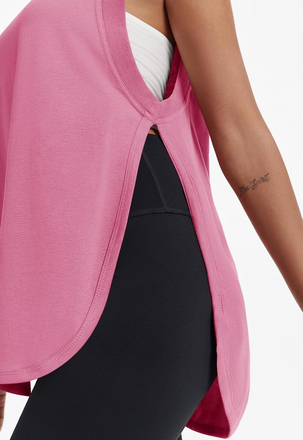 Tankaneo Womens Side Slit Workout Tank Tops Cotton Sleeveless T Shirts Oversized Summer Casual Yoga Gym Tees(Bright Pink)