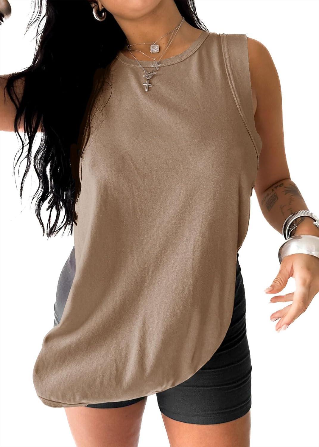 Tankaneo Womens Side Slit Workout Tank Tops Cotton Sleeveless T Shirts Oversized Summer Casual Yoga Gym Tees(Khaki)