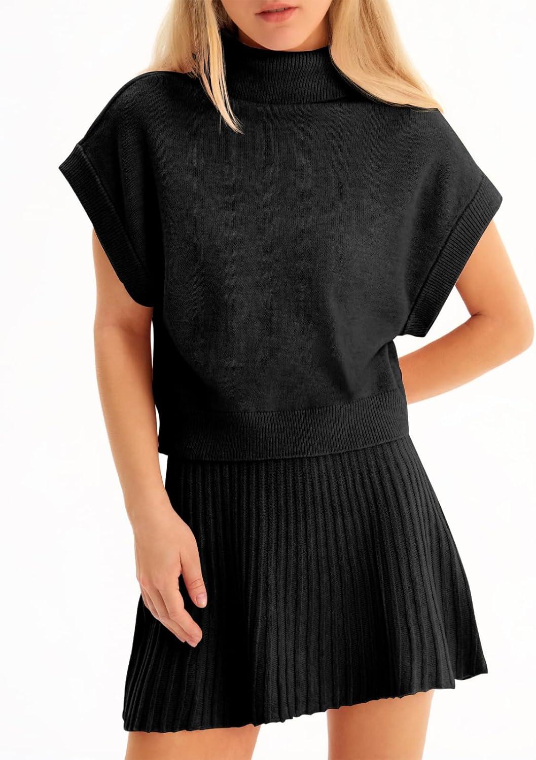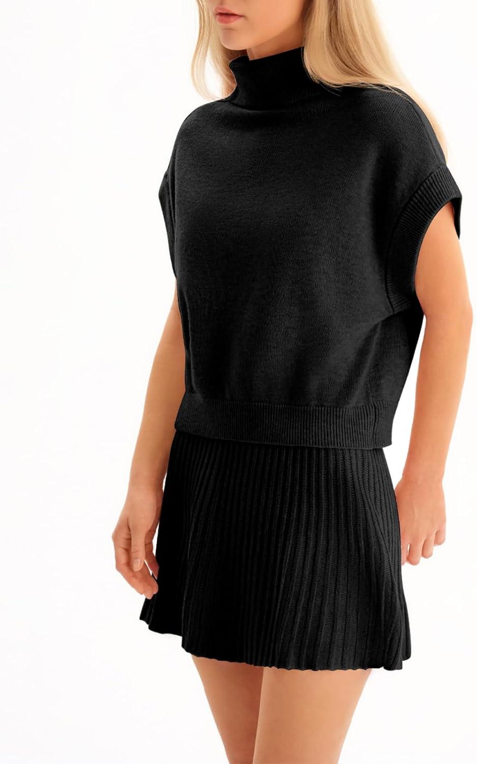 Tankaneo Womens Skirt 2 Piece Sets Sweater Set 2025 Turtleneck Cap Sleeve Crop Top and Pleated Mini Skirt Travel Outfits(Black)