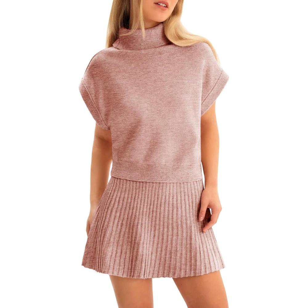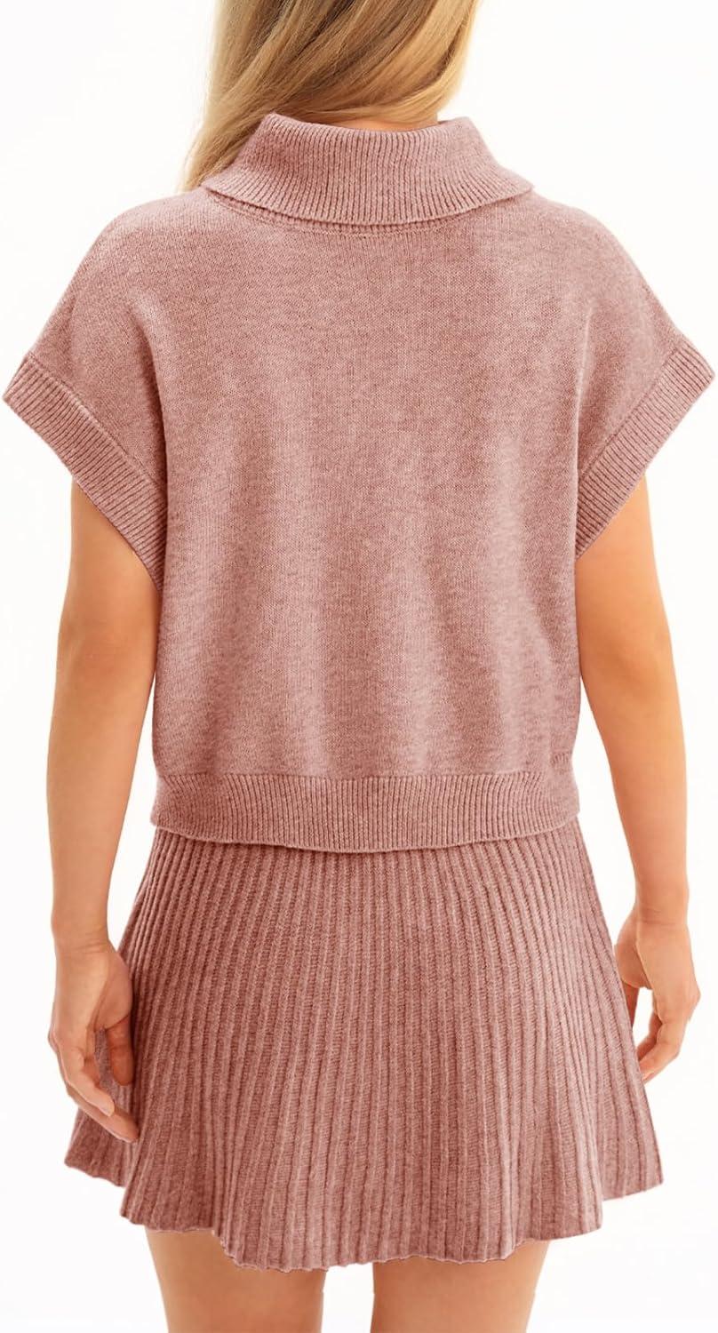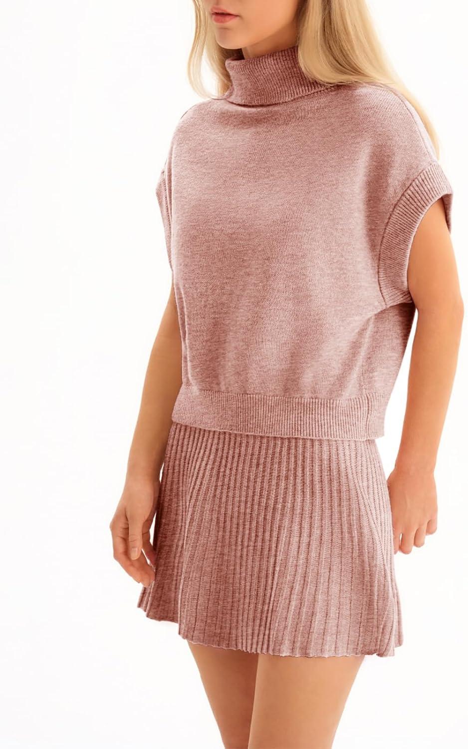 Tankaneo Womens Skirt 2 Piece Sets Sweater Set 2025 Turtleneck Cap Sleeve Crop Top and Pleated Mini Skirt Travel Outfits(Pink)