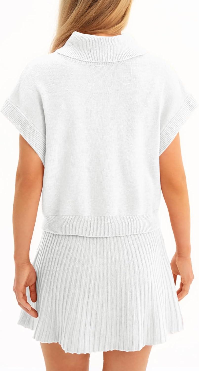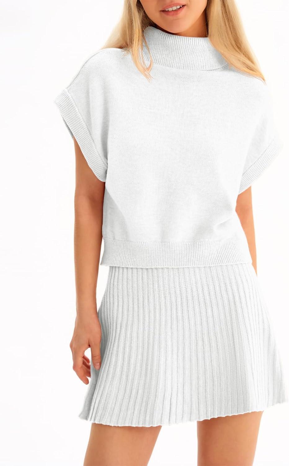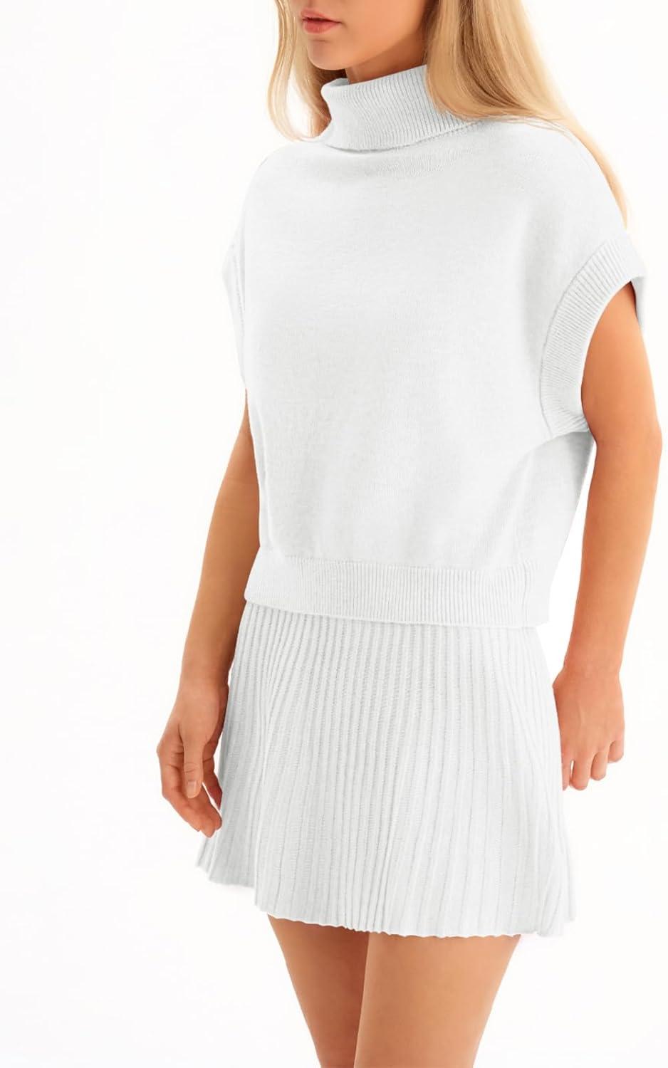 Tankaneo Womens Skirt 2 Piece Sets Sweater Set 2025 Turtleneck Cap Sleeve Crop Top and Pleated Mini Skirt Travel Outfits(White)