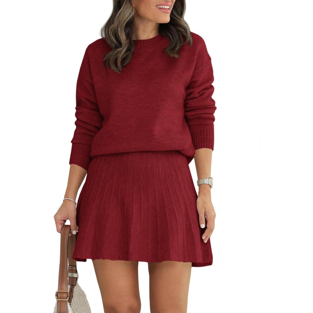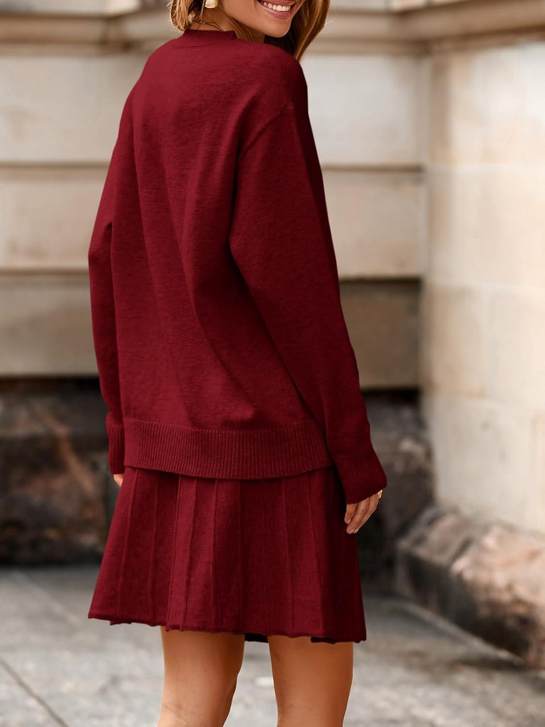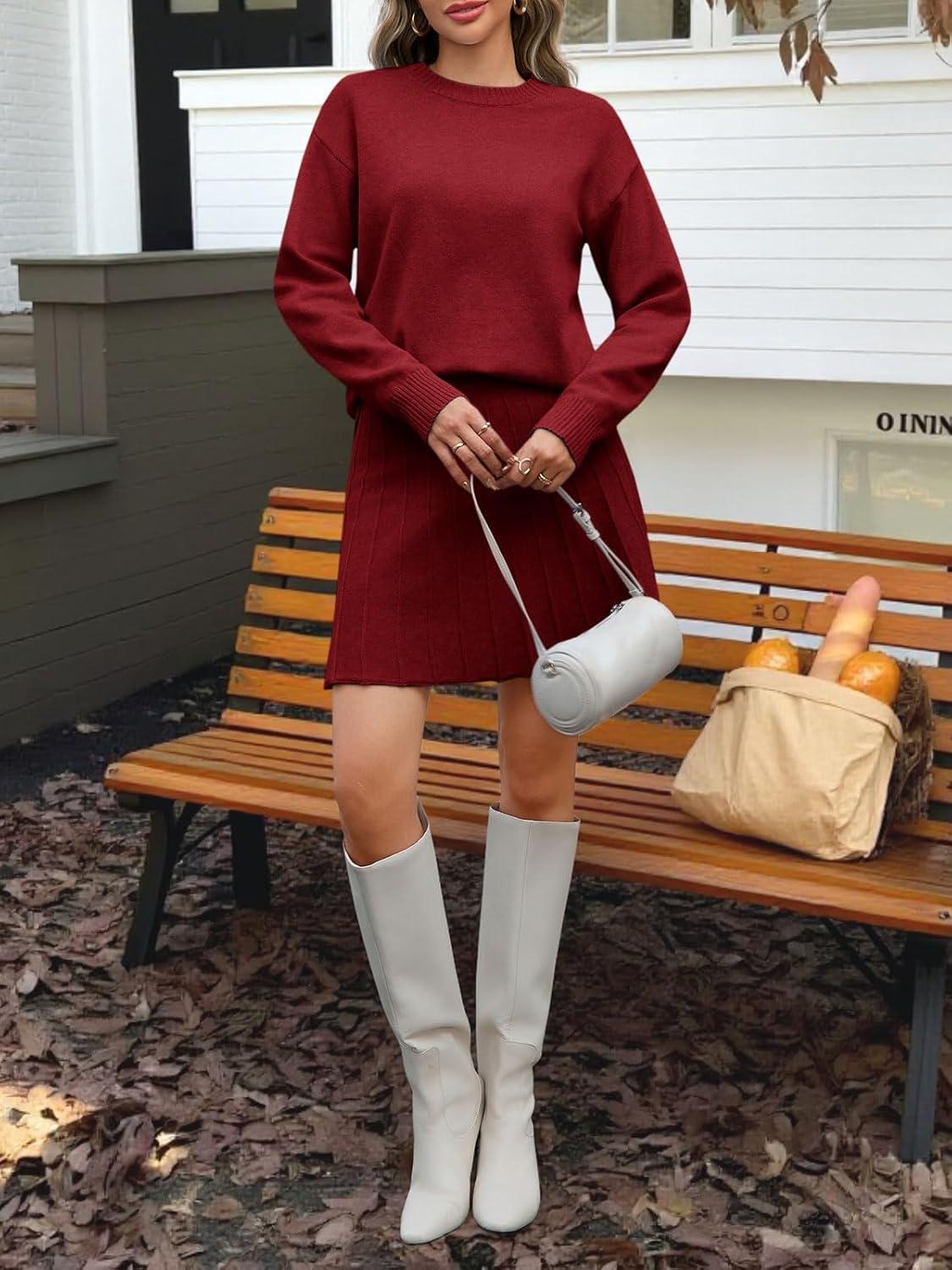 Tankaneo Womens Skirt 2 Piece Sweater Set Long Sleeve Crewneck Sweaters Pleated Mini Skirt Knit Lounge Sets(Burgundy)