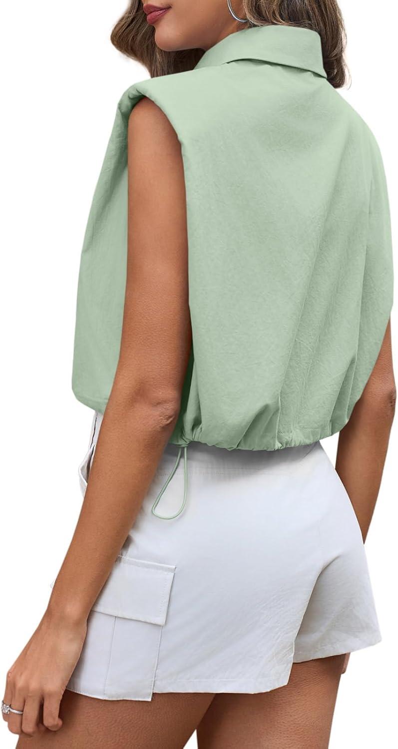 Tankaneo Womens Sleeveless Button Down Shirts Casual Loose V Neck Pad Shoulder Crop Tank Top(Bean Green)