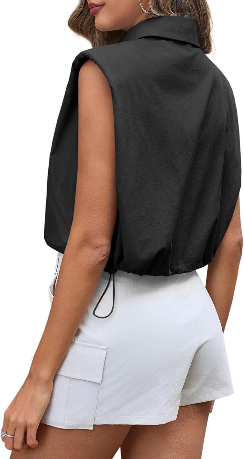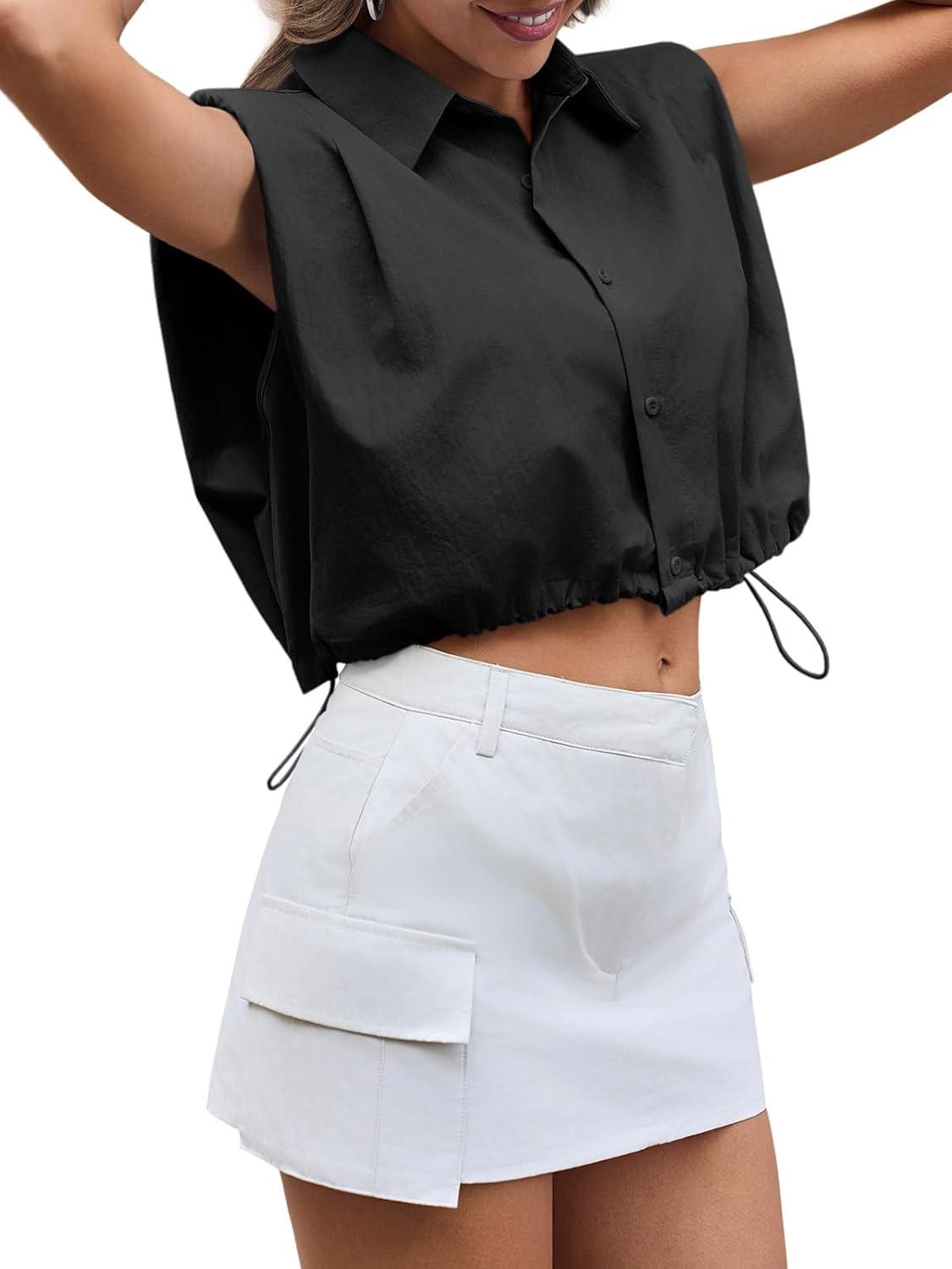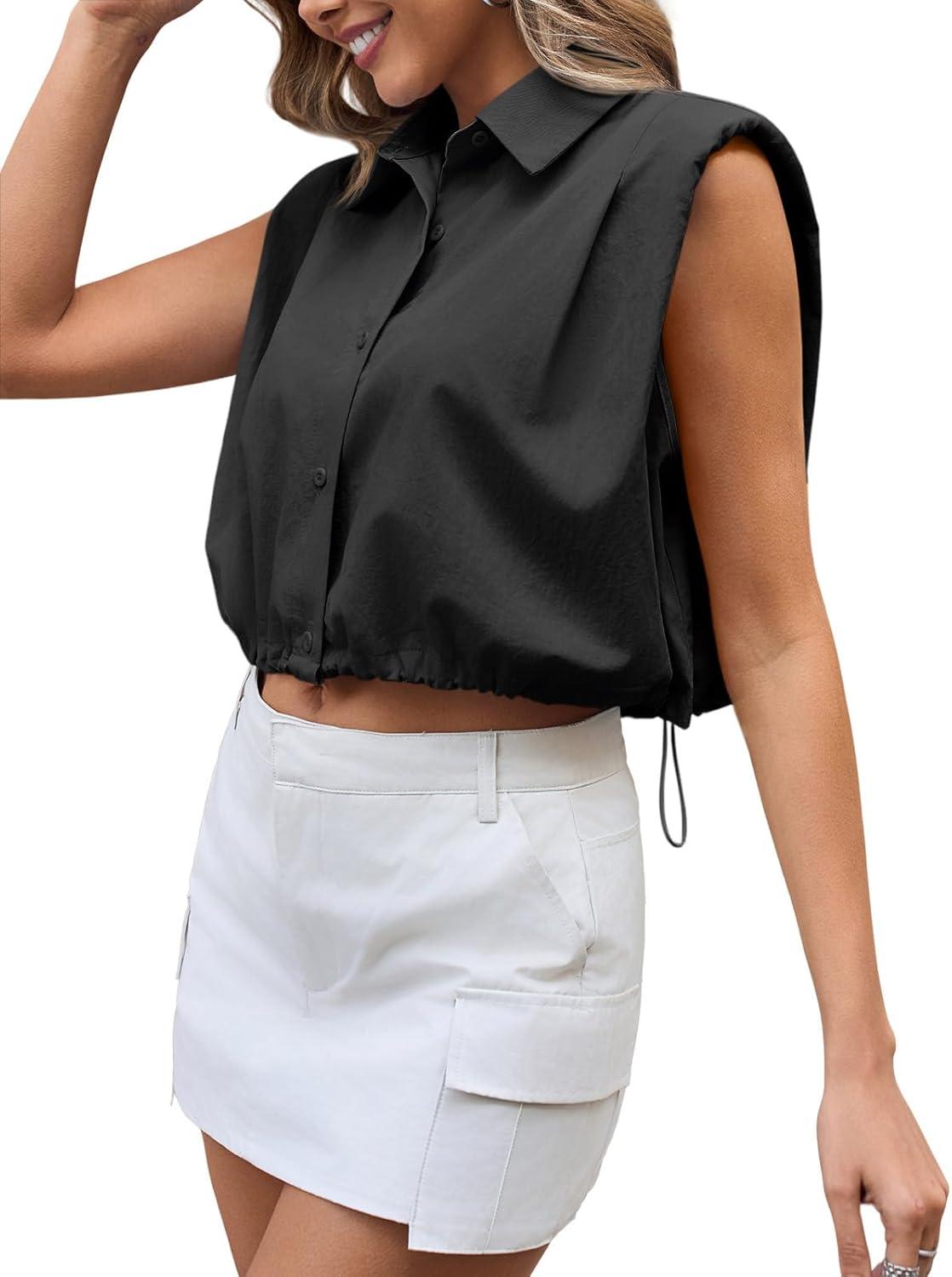 Tankaneo Womens Sleeveless Button Down Shirts Casual Loose V Neck Pad Shoulder Crop Tank Top(Black)