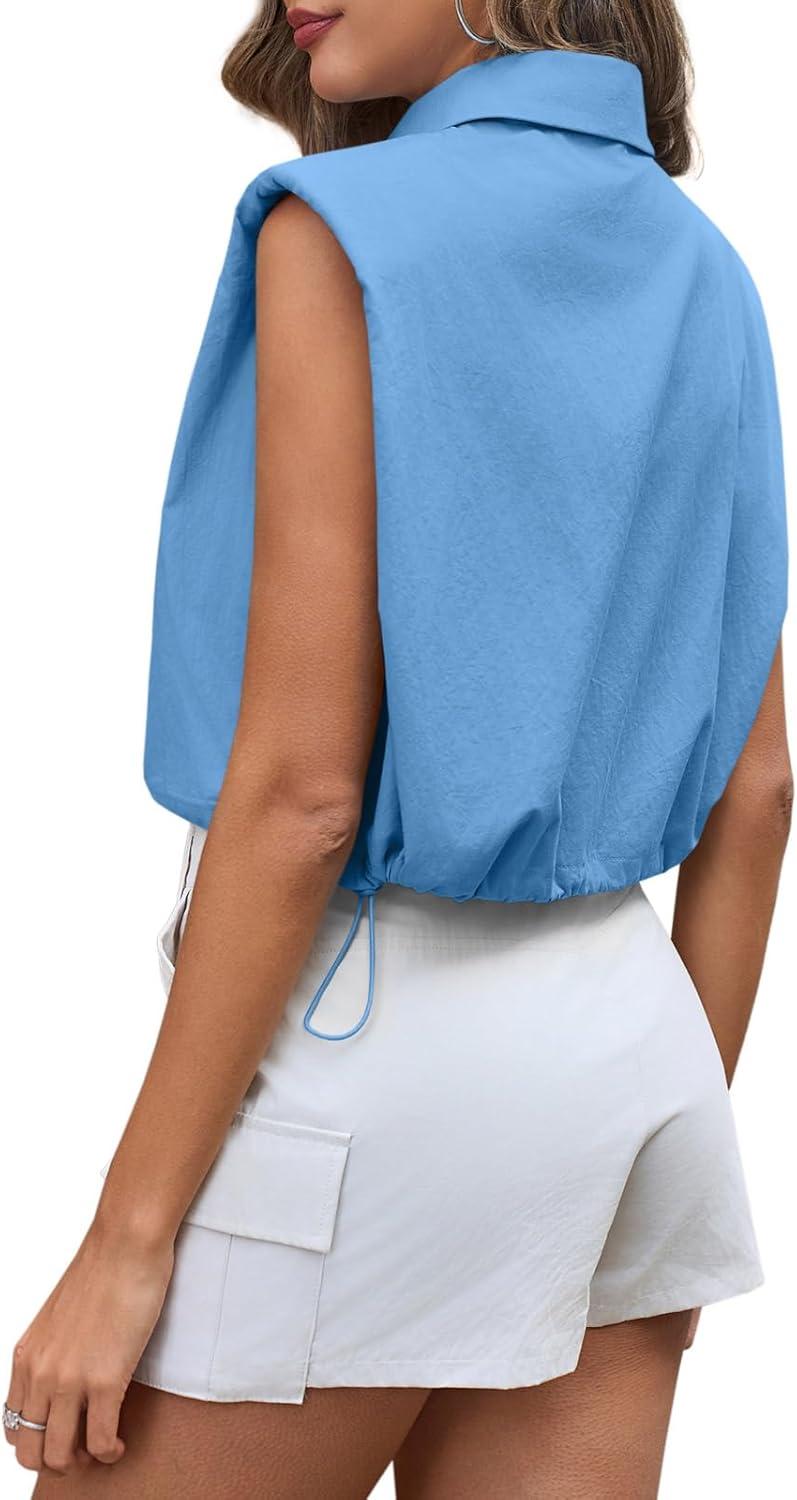 Tankaneo Womens Sleeveless Button Down Shirts Casual Loose V Neck Pad Shoulder Crop Tank Top(Navy)