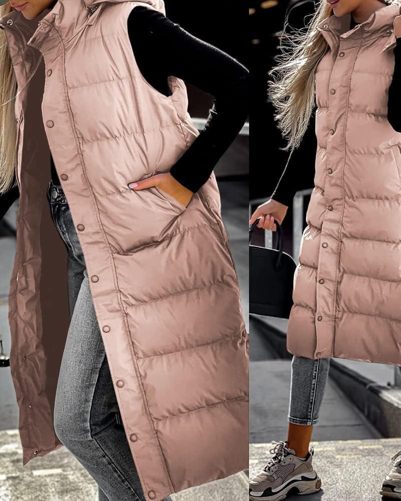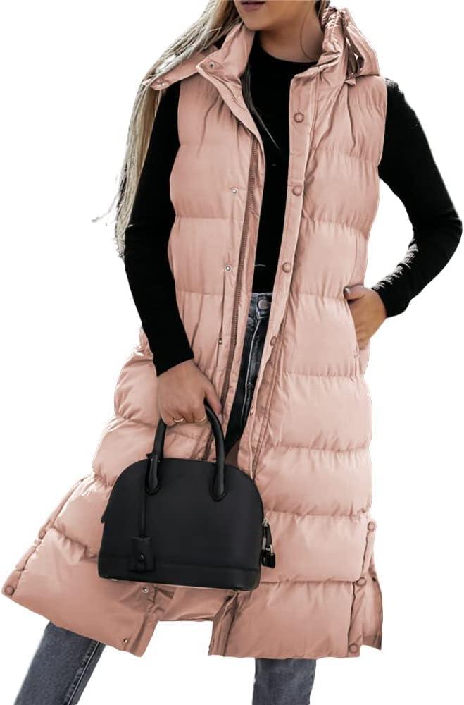 Tankaneo Women’s Sleeveless Long Quilted Vest Hooded Button Down Puff Vest Cotton Padded Jacket Winter Outerwear(Pink)