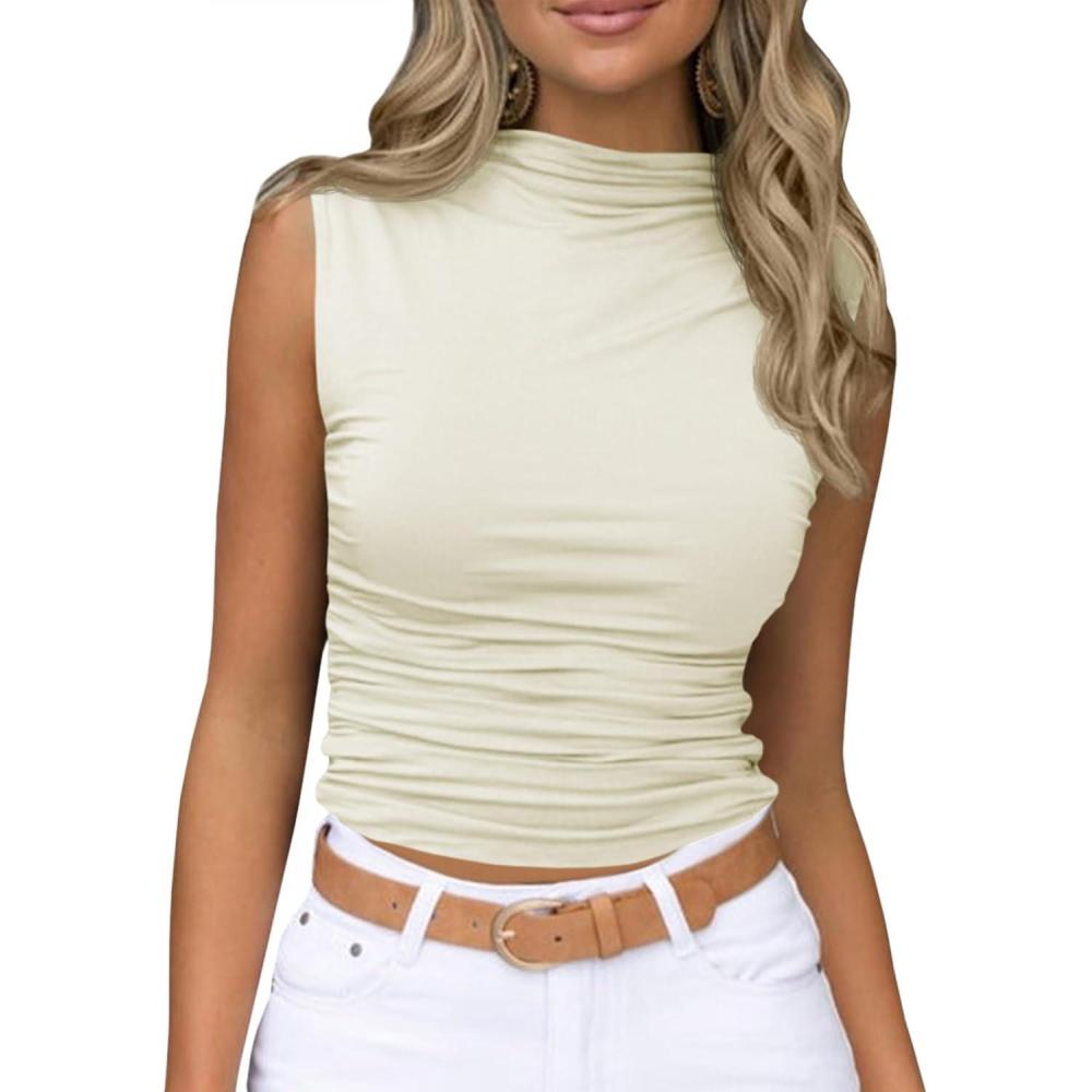 Tankaneo Womens Sleeveless Mock Turtleneck Tank Tops Slim Fitted Ruched Crop Top Shirts(Apricot)