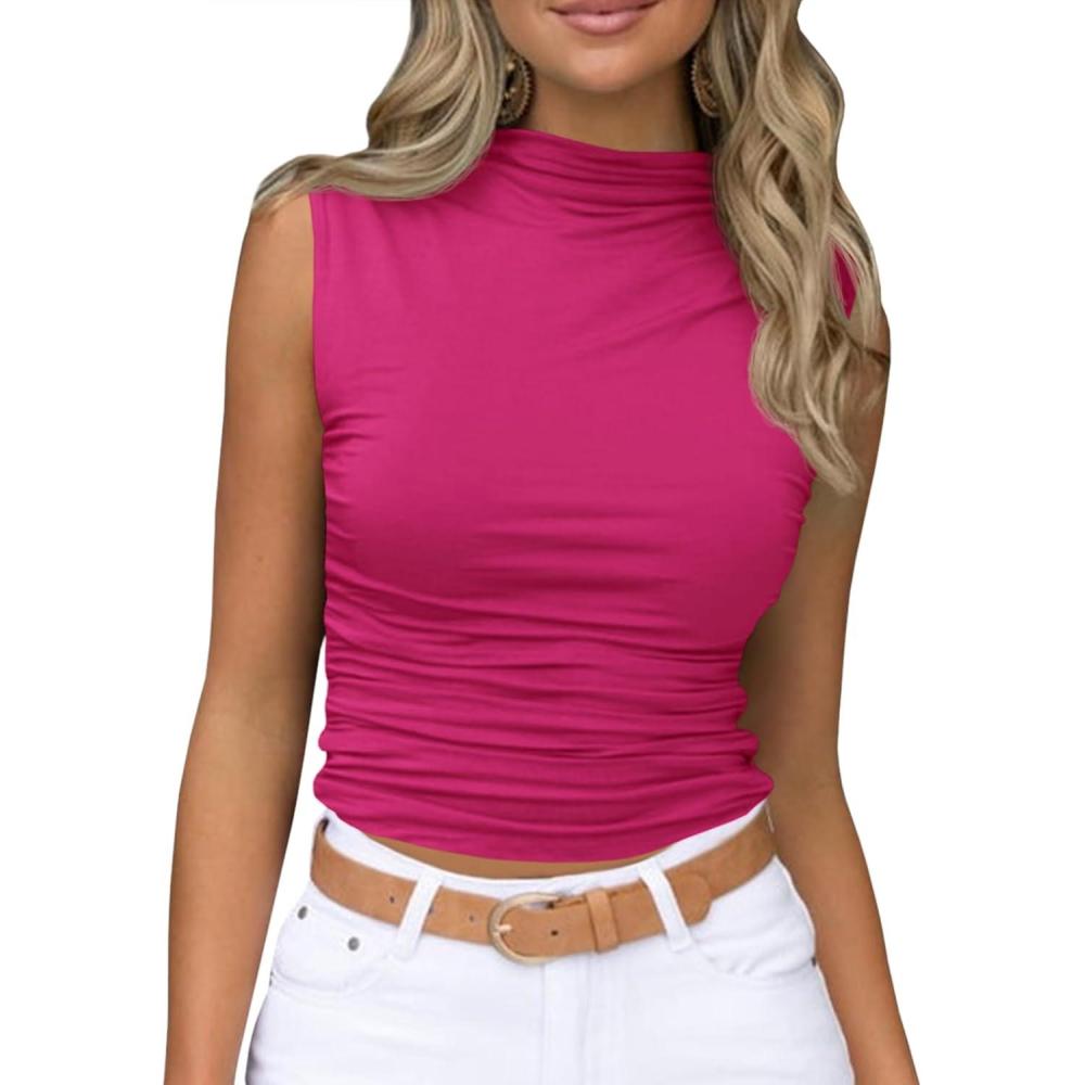 Tankaneo Womens Sleeveless Mock Turtleneck Tank Tops Slim Fitted Ruched Crop Top Shirts(Rose Red)