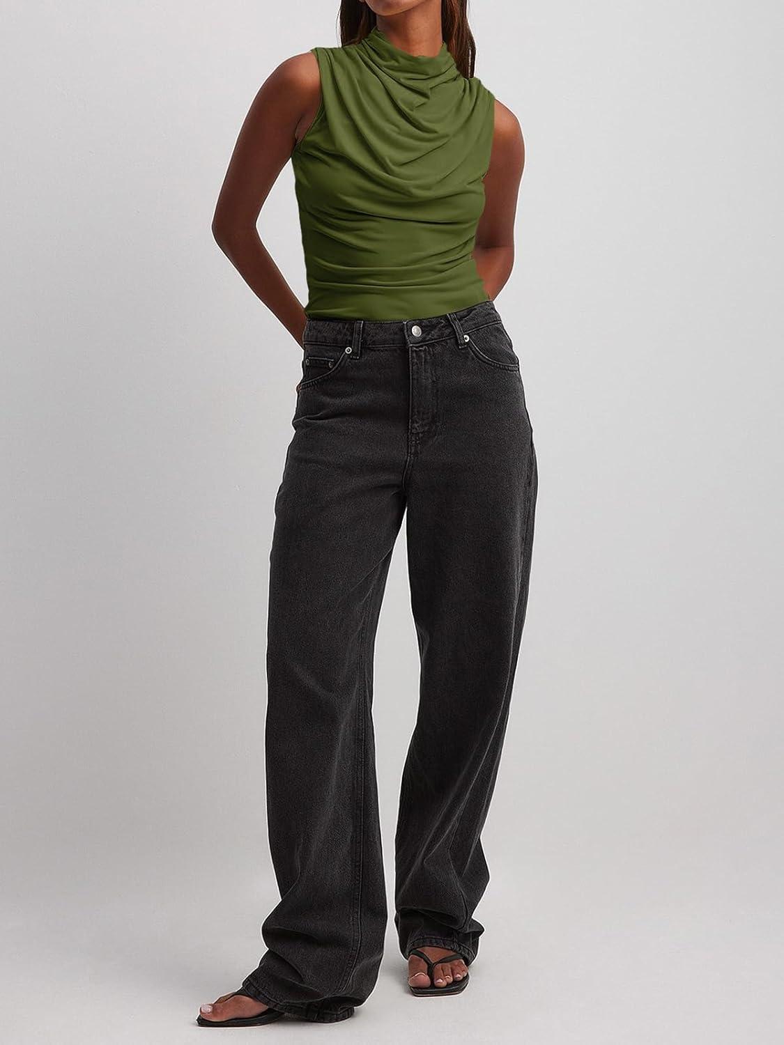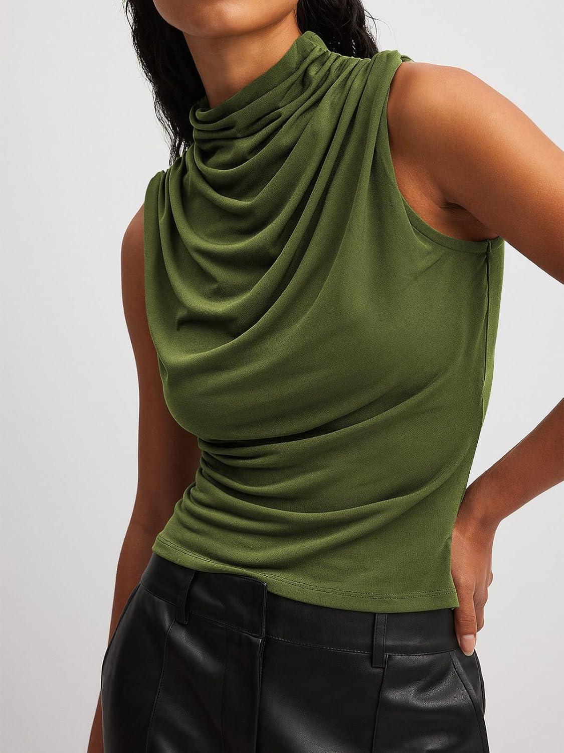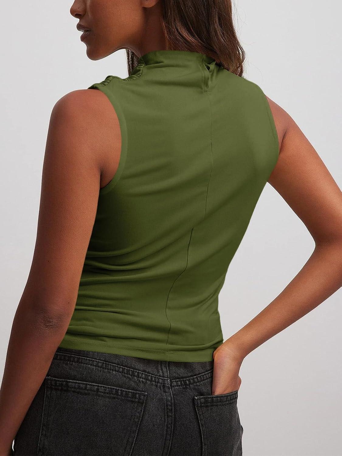 Tankaneo Womens Sleeveless Tank Tops Slim Fitted Mock Neck Draped Stretchy Summer Casual Ruched Tops(Army Green)