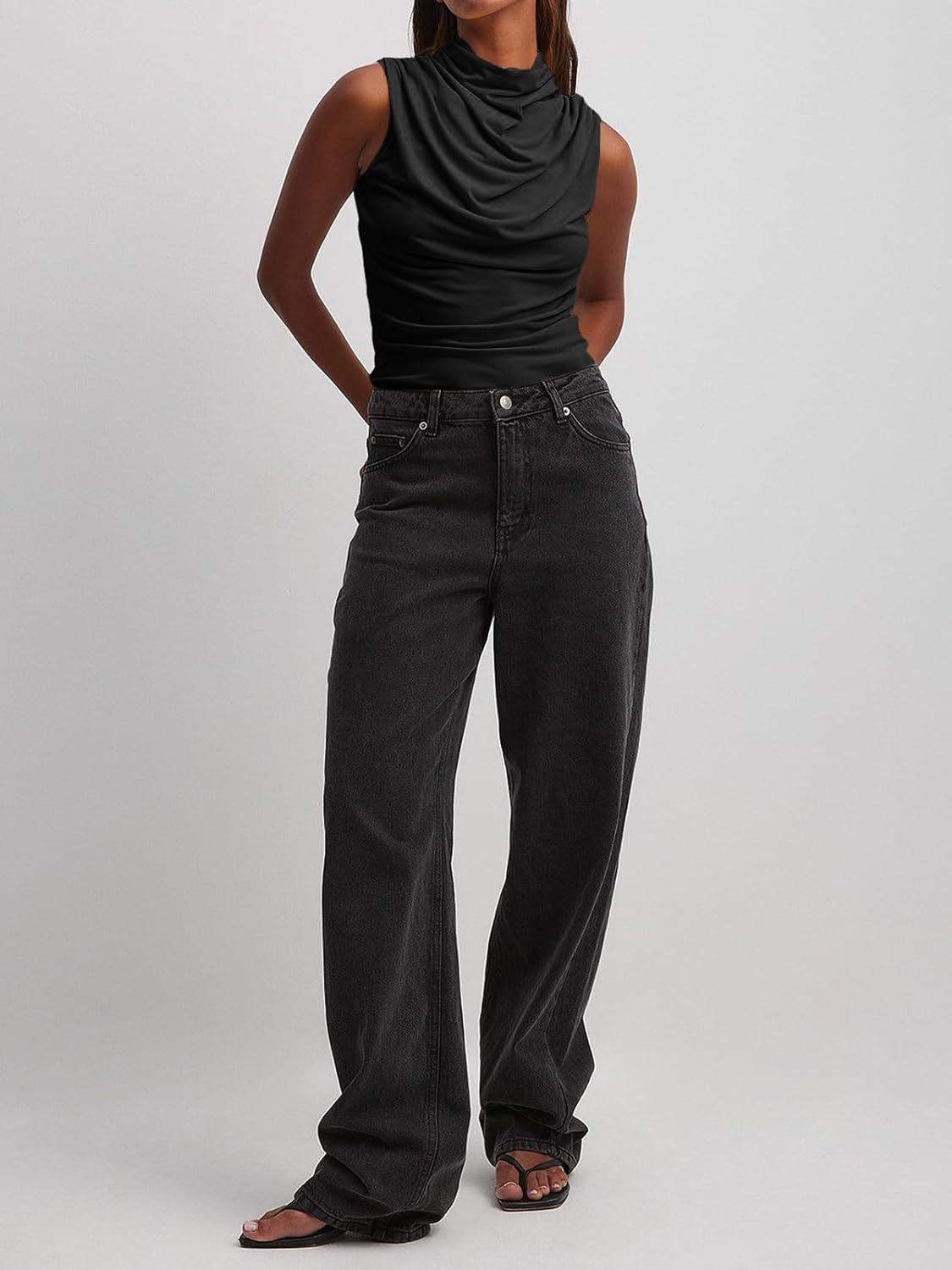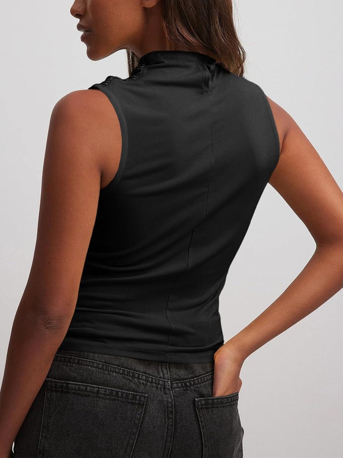Tankaneo Womens Sleeveless Tank Tops Slim Fitted Mock Neck Draped Stretchy Summer Casual Ruched Tops(Black)