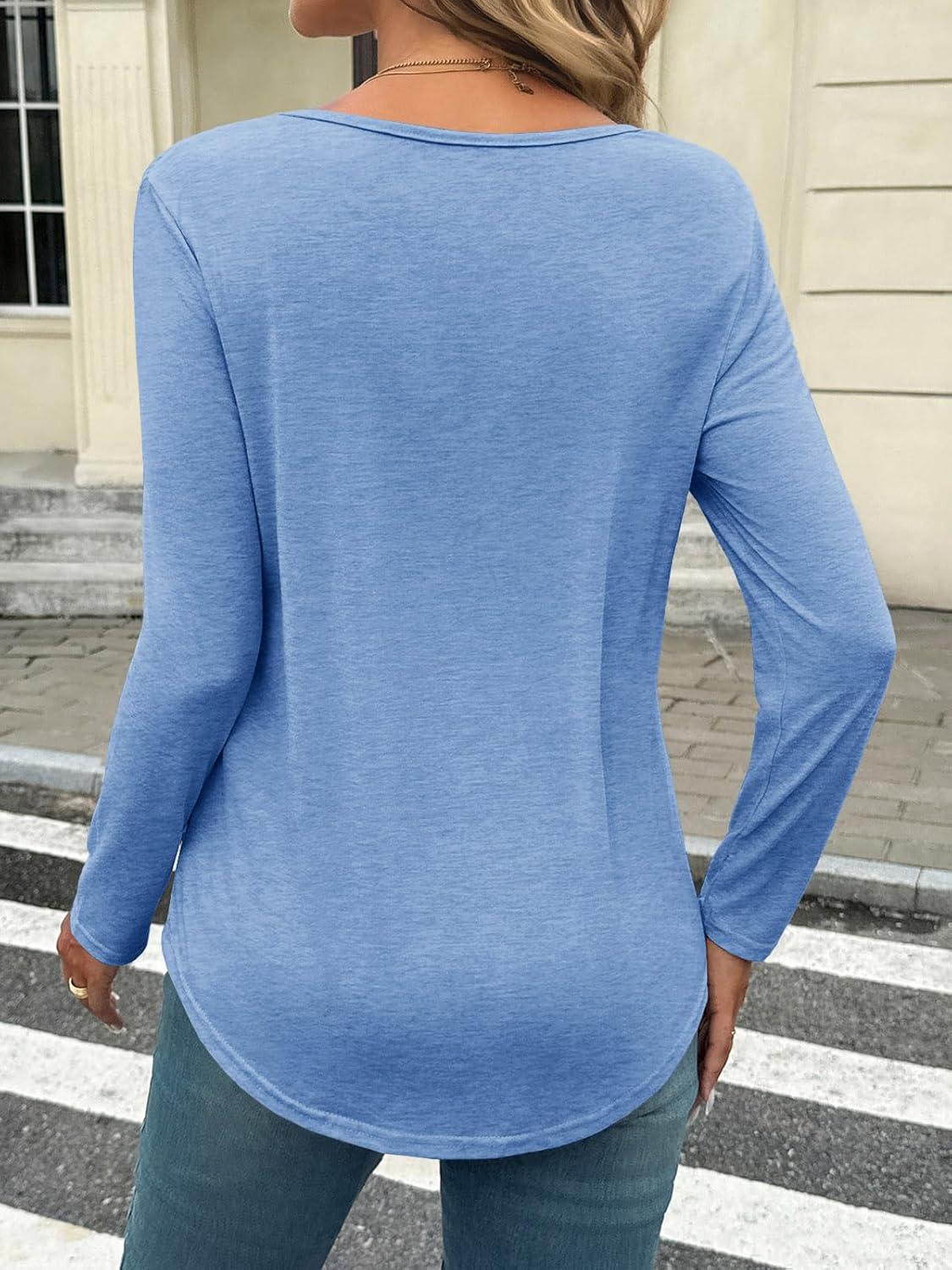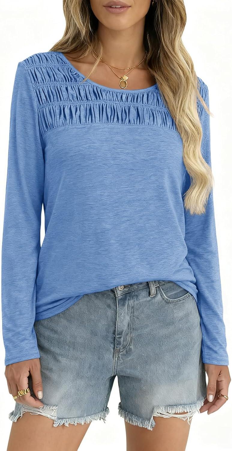 Tankaneo Womens Smocked Long Sleeve Shirts Casual Crew Neck Curved Hem Tunic Tops Loose Fit Basic Tee(Baby Blue)