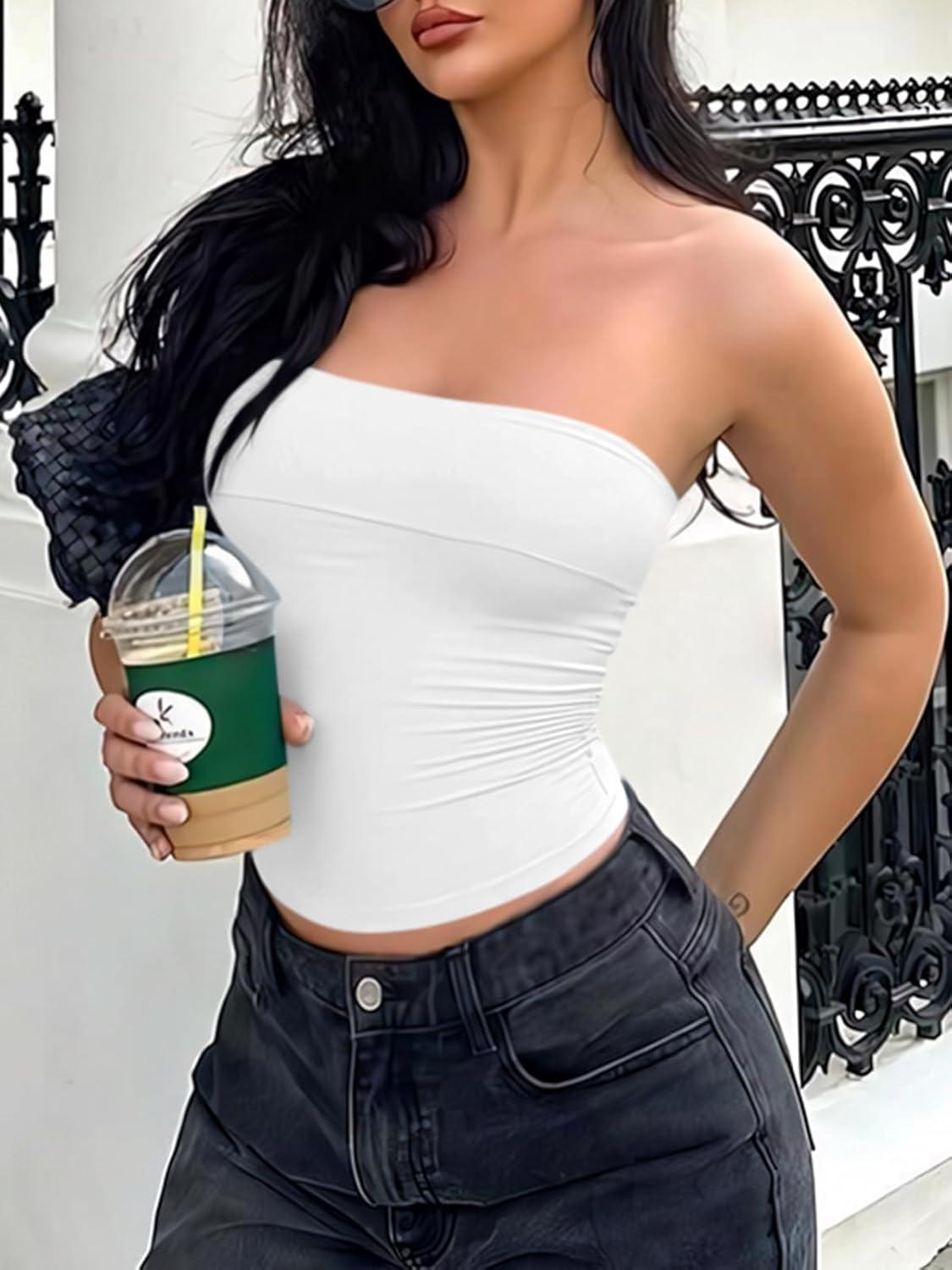 Tankaneo Womens Strapless Tube Tops Cropped Y2K Going Out Fitted Tank Tops Summer Trendy Layered Bandeau Shirts(Beige)