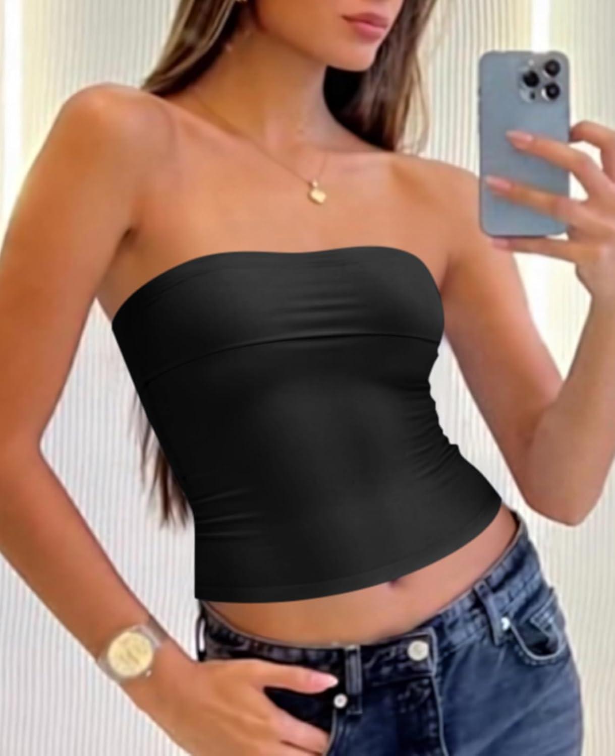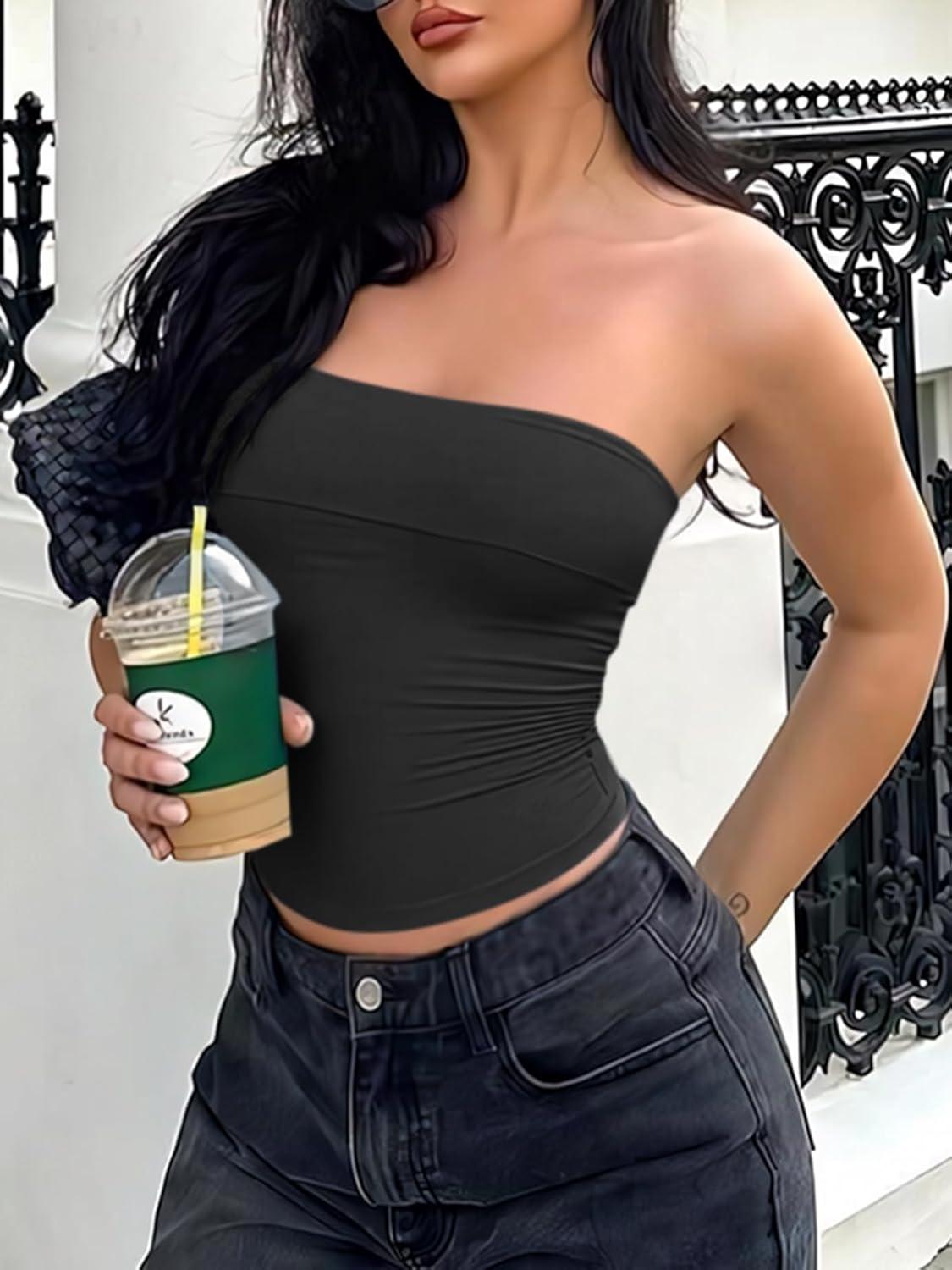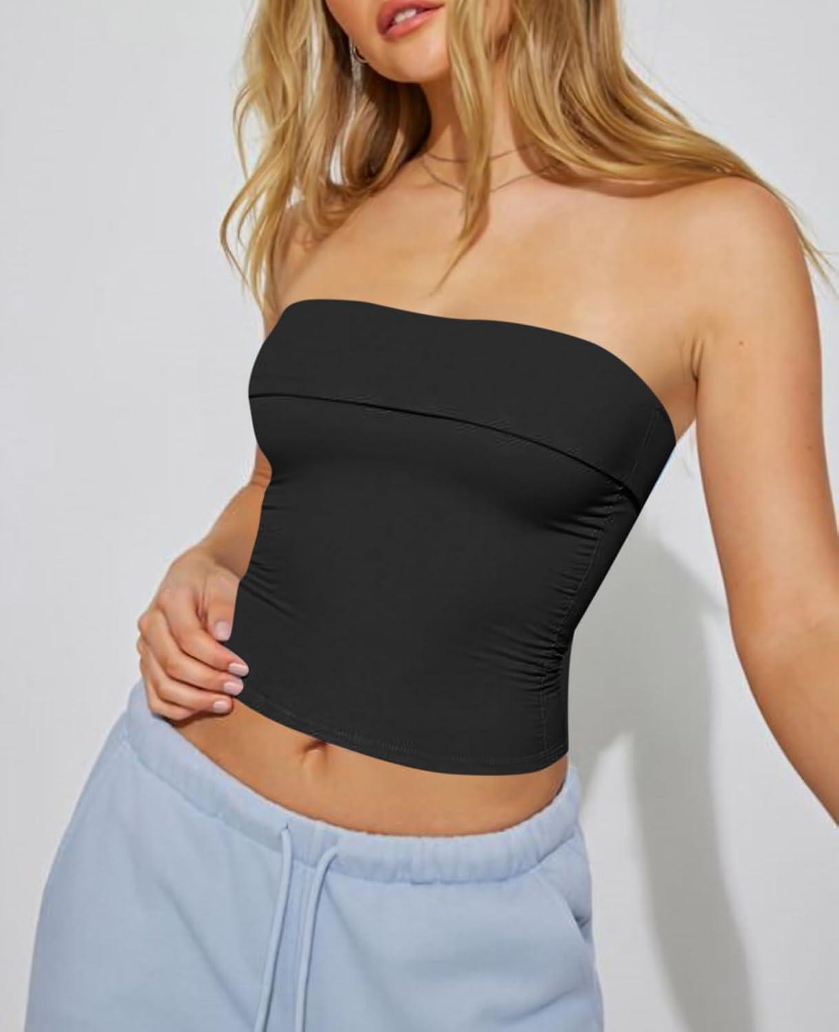 Tankaneo Womens Strapless Tube Tops Cropped Y2K Going Out Fitted Tank Tops Summer Trendy Layered Bandeau Shirts(Black)
