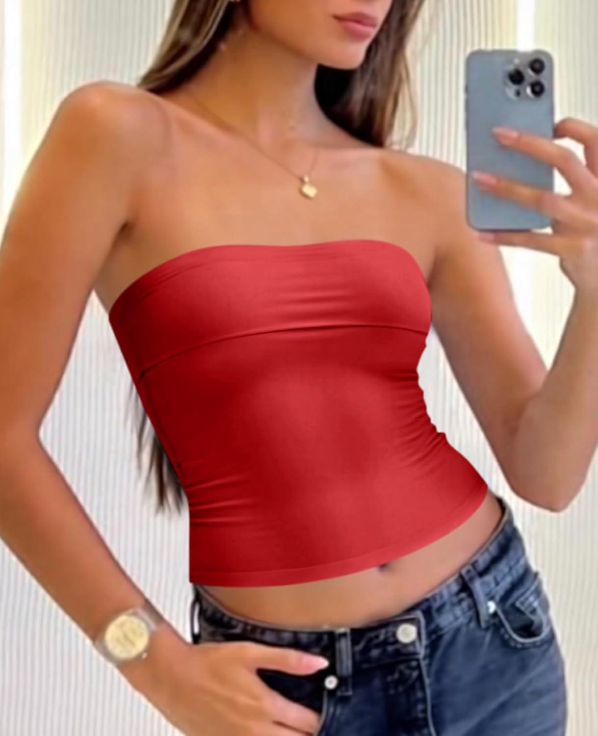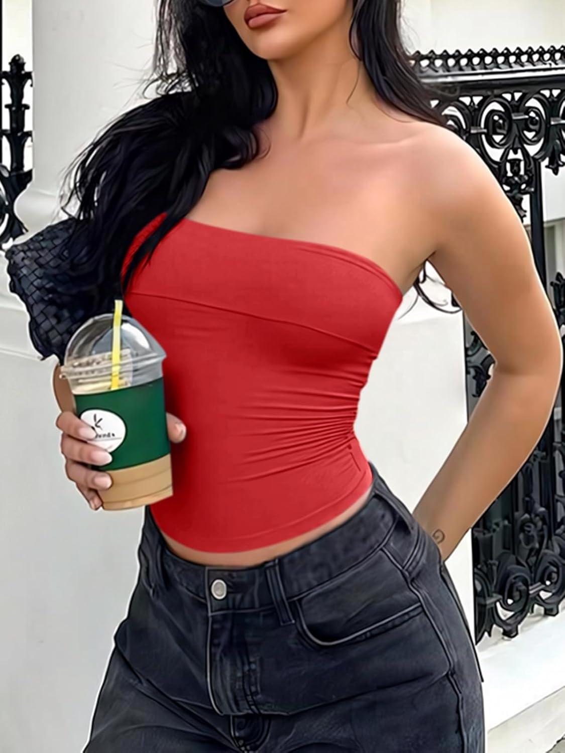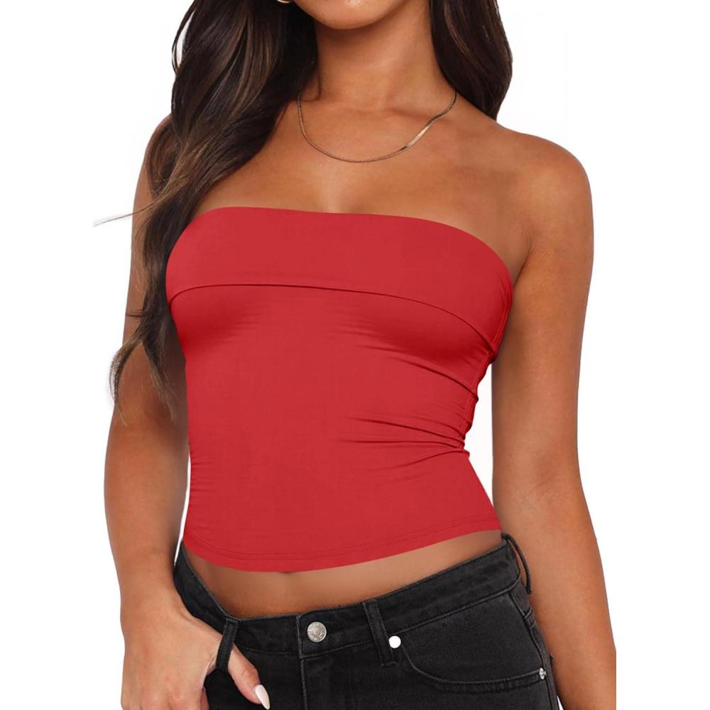 Tankaneo Womens Strapless Tube Tops Cropped Y2K Going Out Fitted Tank Tops Summer Trendy Layered Bandeau Shirts(Red)