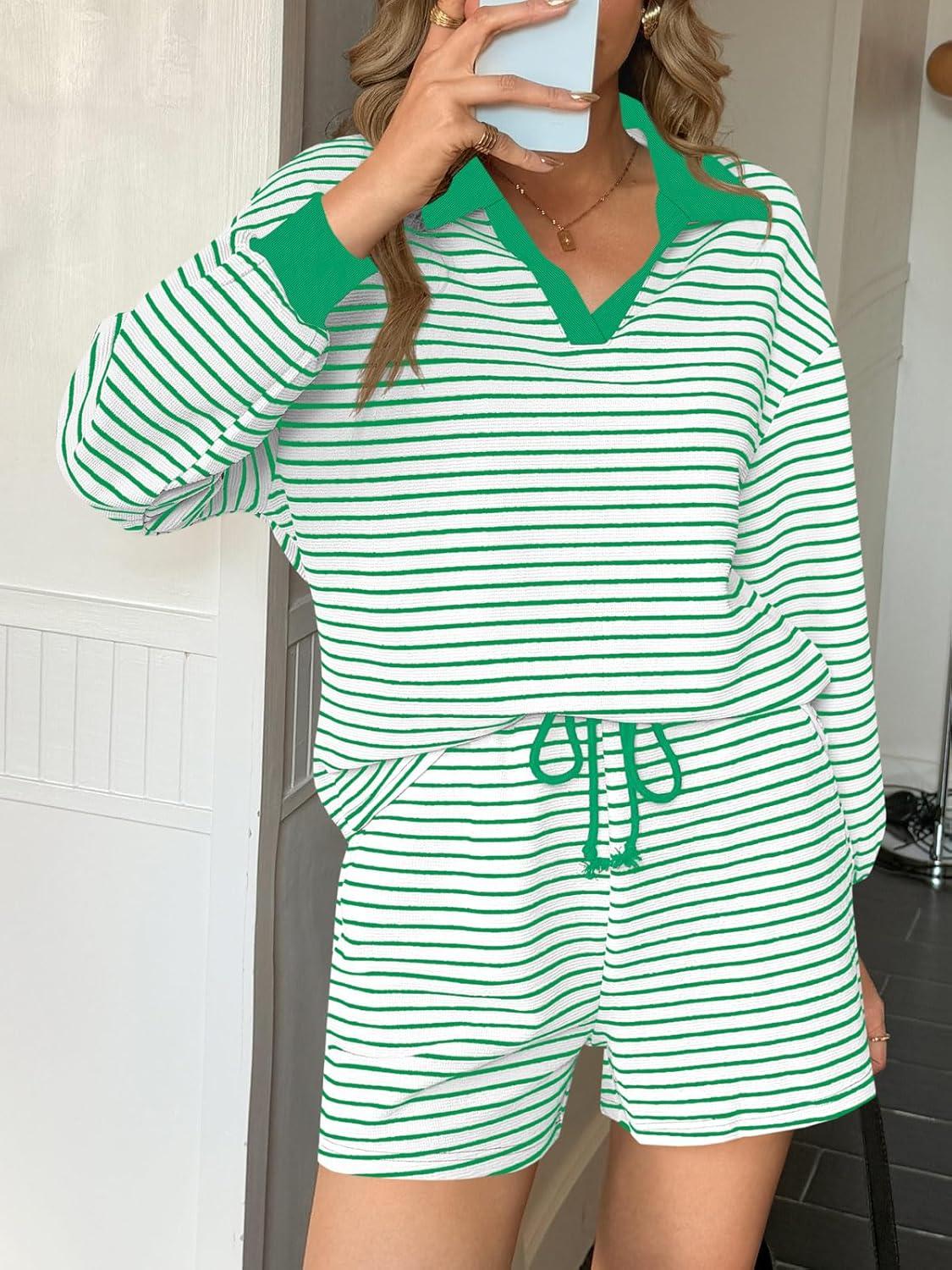 Tankaneo Womens Striped 2 Piece Outfits Casual Sweatshirt short Set Long Sleeve Workout Set Matching Lounge Sets(Green)