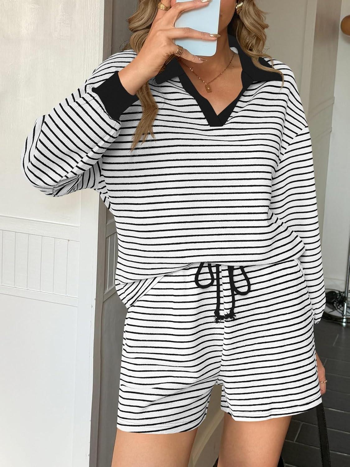 Tankaneo Womens Striped 2 Piece Outfits Casual Sweatshirt short Set Long Sleeve Workout Set Matching Lounge Sets(White)