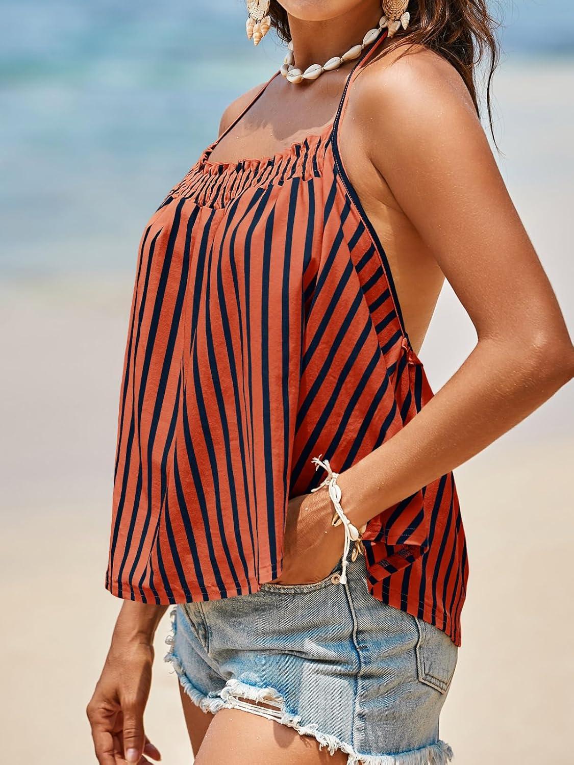 Tankaneo Womens Striped Halter Camisole Tank Tops Vacation Open Back Crop Tops Flowy Pleated Y2k Tshirts(Orange)