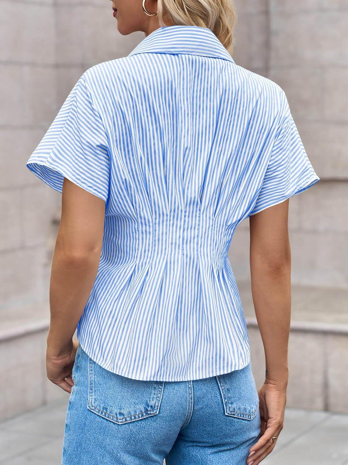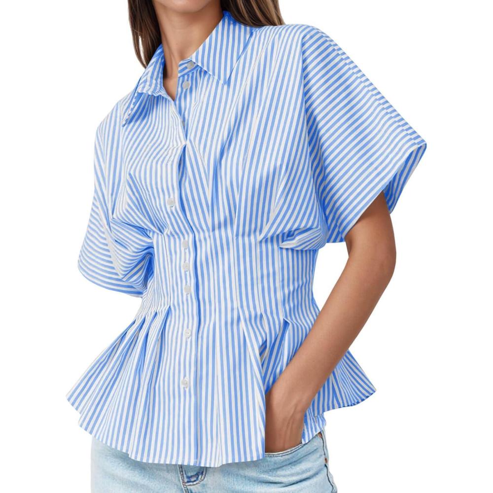 Tankaneo Womens Striped Peplum Button Down Shirts Short Sleeve Pleated Tops Summer Business Casual Blouses(Blue)