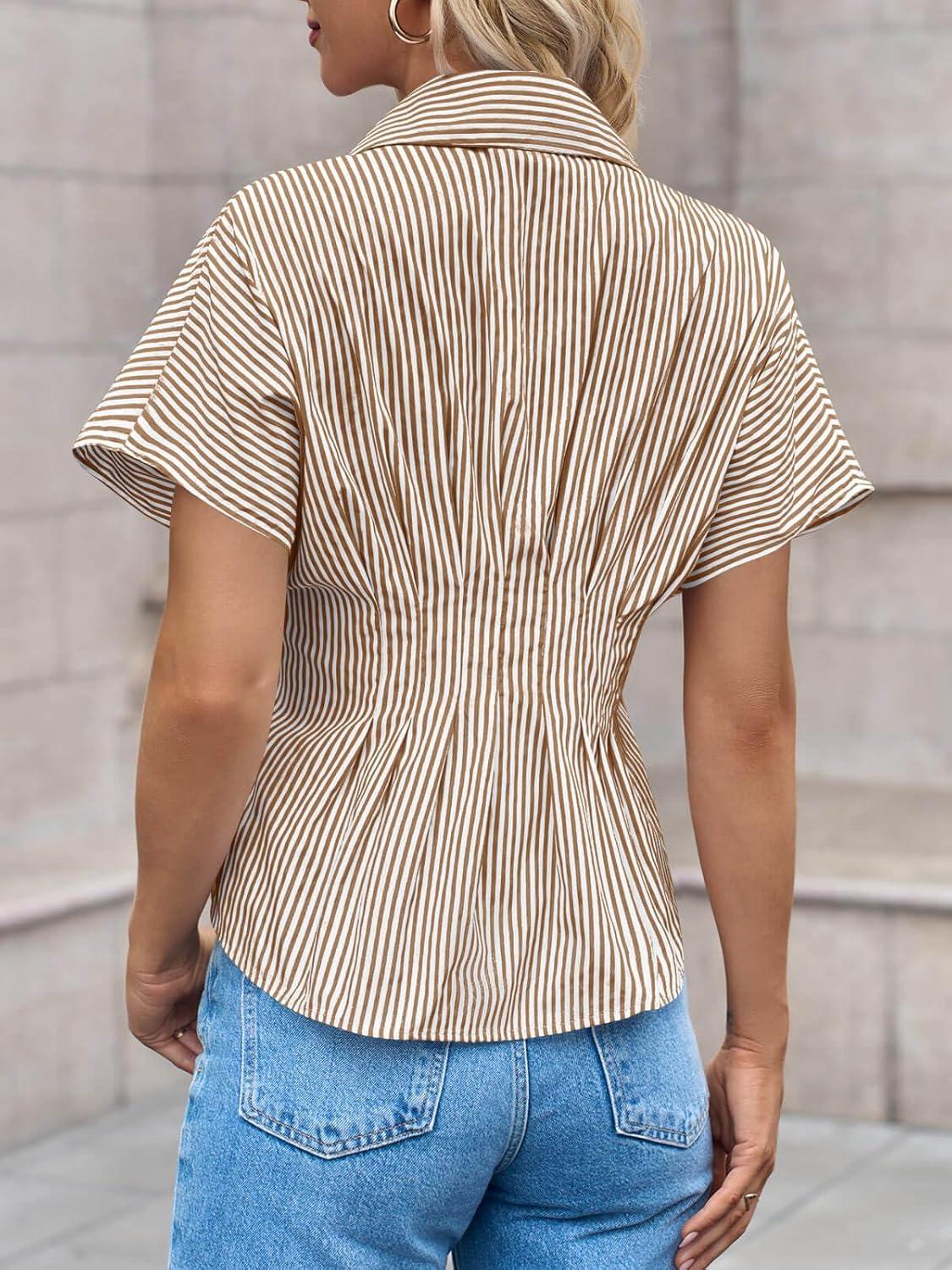 Tankaneo Womens Striped Peplum Button Down Shirts Short Sleeve Pleated Tops Summer Business Casual Blouses(Brown)
