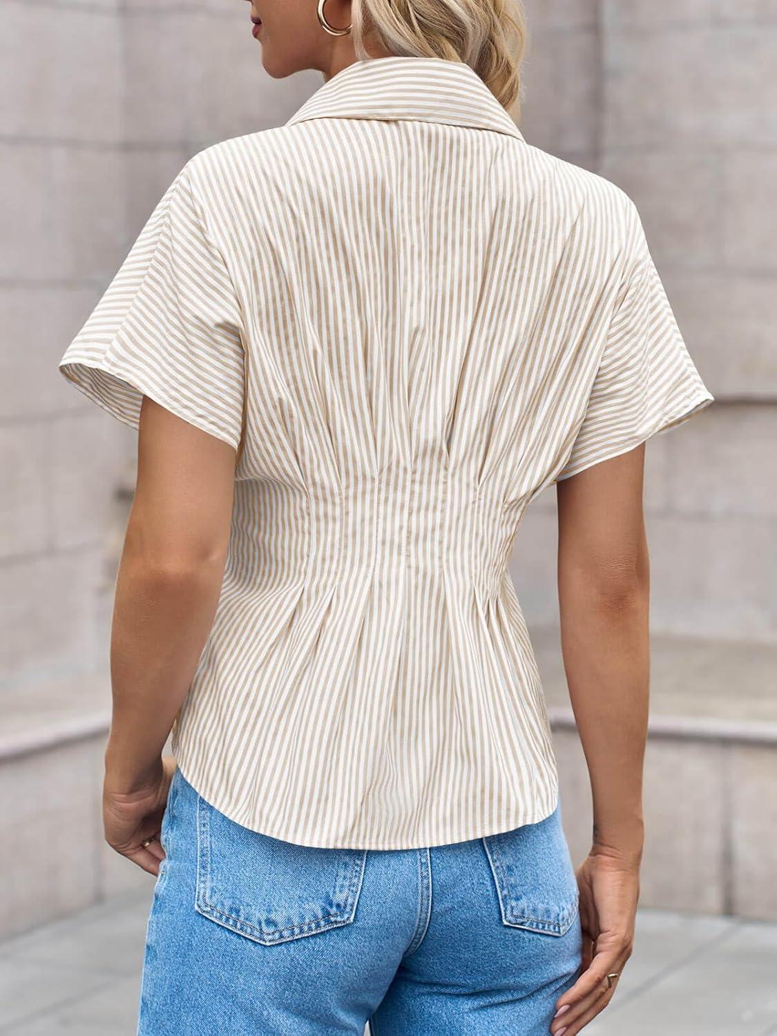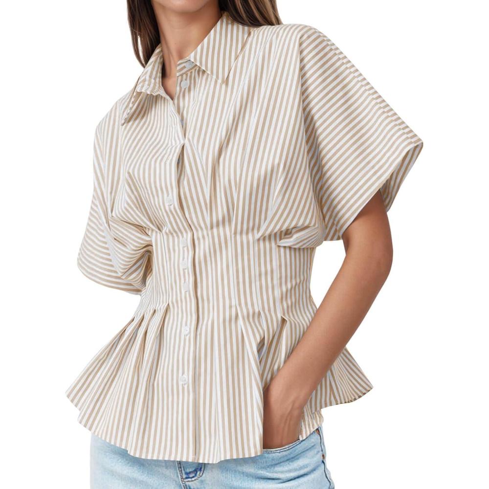 Tankaneo Womens Striped Peplum Button Down Shirts Short Sleeve Pleated Tops Summer Business Casual Blouses(Khaki)